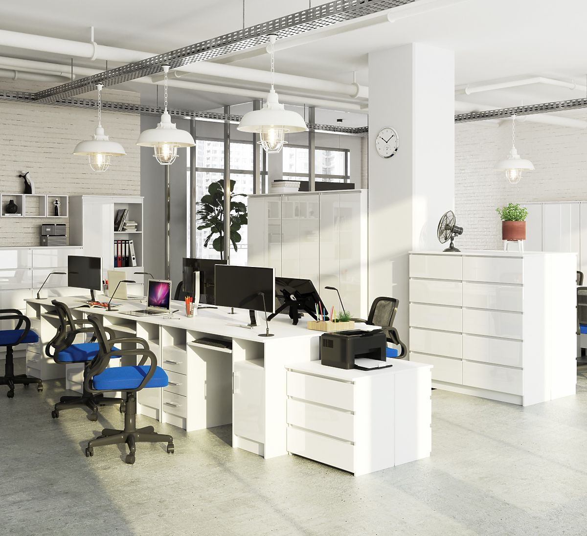 Predstavljena pisalna miza se odlikuje po preprosti obliki in elegantnem videzu - idealna za tiste, ki cenijo funkcionalne in estetske rešitve. Pohištvo je izdelano iz visokokakovostne laminirane plošče debeline 16 mm, ki je zelo odporna proti obrabi. Njeni robovi so oblepljeni z ABS robom, kar povečuje njihovo odpornost proti poškodbam. Posebnost je, da so čela predalov in vrat izdelana iz MDF plošče z visokim sijajem - odlikuje se z najvišjim možnim standardom sijaja. Pohištvo je bele barve in ima srebrne ročaje. Pisalna miza vsebuje tri predale, dve odprti polici in eno polico z vrati, kar omogoča veliko prostora za uporabo. To omogoča dobro organizacijo dela, saj so pomembni pripomočki in naprave lahko na dosegu roke. Dimenzije mize so 124 cm dolžine, 74 cm višine in 52 cm globine. Pohištvo je namenjeno samostojni montaži. Pri tem pomaga priložena navodila. Pisalna miza se odlično prilega tako delovnemu okolju kot domu.