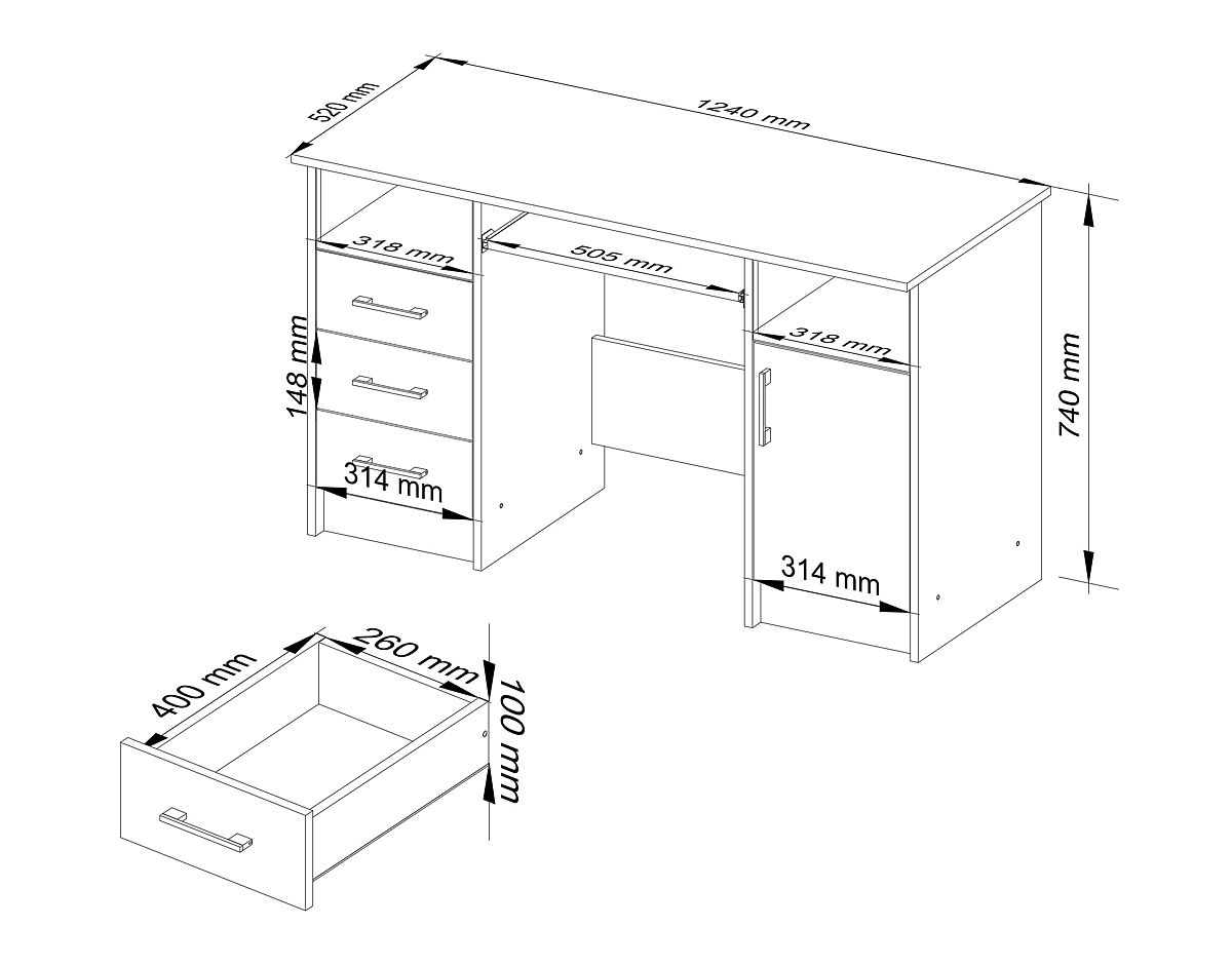Izdelano iz laminirane plošče, odporne proti obrabi. Plošča, stranice in čela so opremljeni z ABS robom. Ima izvlečno polico za tipkovnico, 3 predale in vrata s čeli iz laminirane plošče.