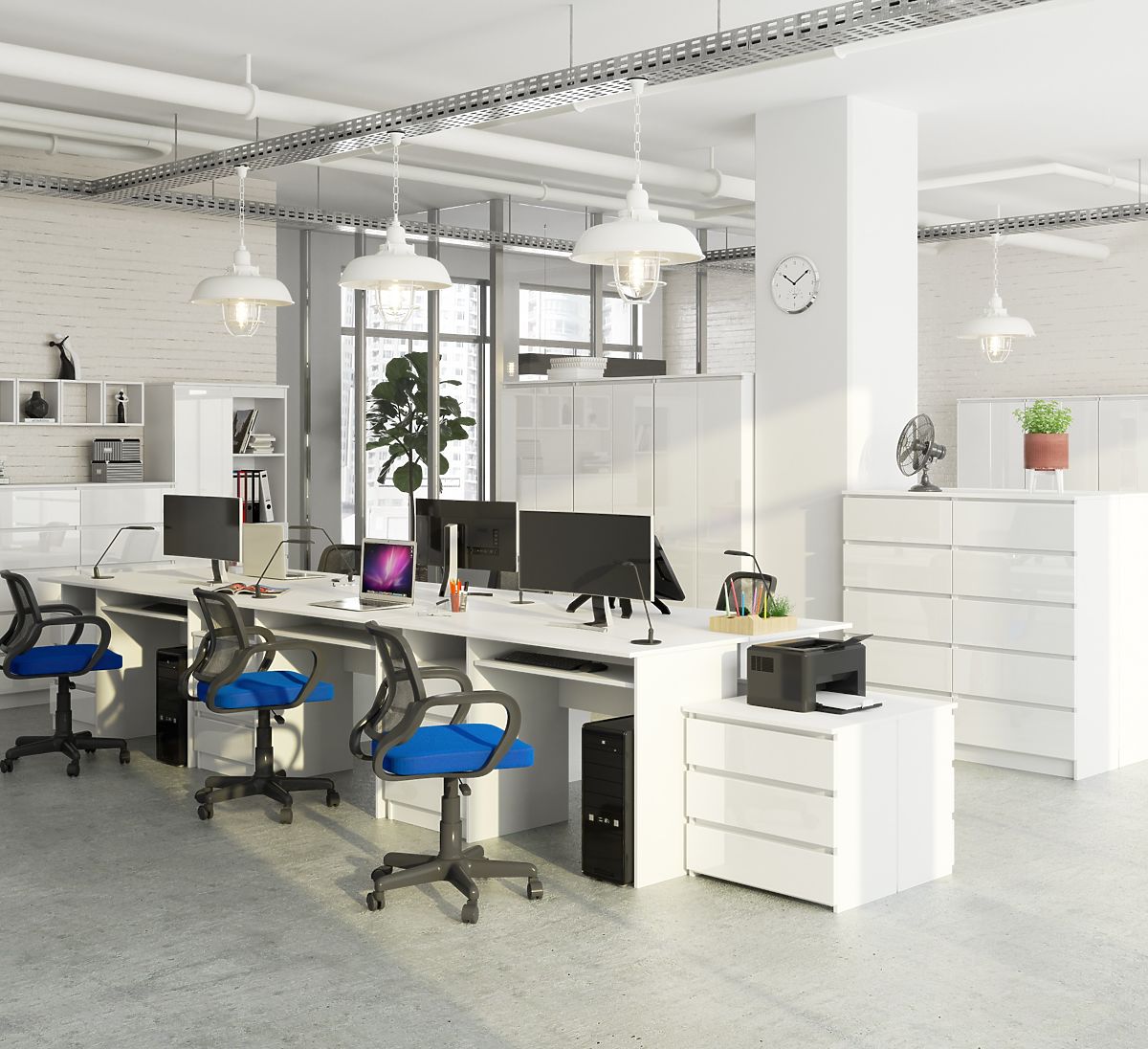 Pohištvo je izdelano iz laminirane plošče debeline 16 milimetrov, ki je trpežna in odporna na obrabo. Vidni robovi mize so obdani z ABS robom, ki se prav tako ponaša z visoko odpornostjo na poškodbe. Polmatni korpus se odlično ujema z akrilnimi čeli v visokem sijaju. Če iščete rešitev z veliko delovno površino in praktičnimi predali, vam priporočamo, da se seznanite z našo ponudbo. Zagotavljamo najvišjo kakovost, funkcionalnost, moderen dizajn in ugodno ceno. K pisalni mizi lahko prilagodite dodatno pisarniško pohištvo, ki je na voljo v naši spletni trgovini. Upamo, da bo izpolnila pričakovanja tudi najbolj zahtevnih strank. Miza je enostavna za čiščenje, njena preprosta in hkrati elegantna oblika pa pohištvu daje brezčasen in univerzalen značaj. Vabimo vas k nakupu.
