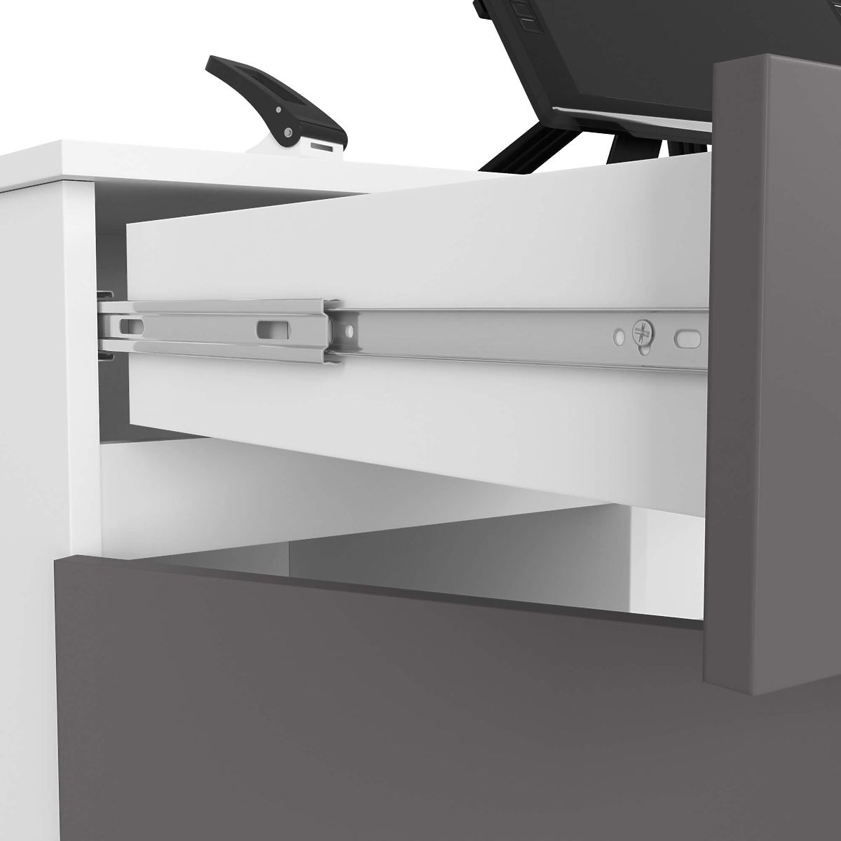 - Predali in polica za tipkovnico se premikajo na kovinskih krogličnih vodilih