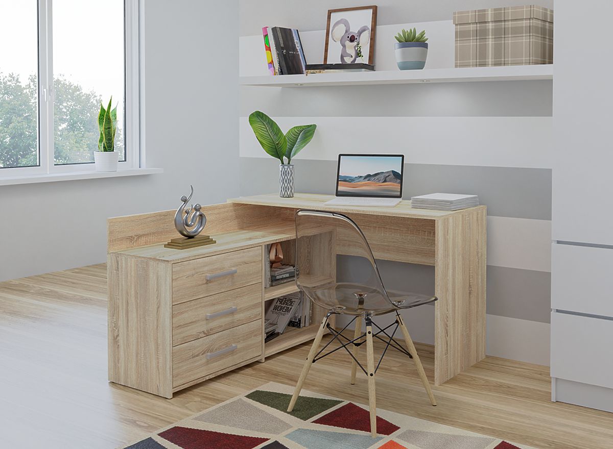 Kotna pisalna miza s 3 predali je funkcionalna rešitev za osebe, ki potrebujejo veliko prostora za delo in udobno razporeditev najpomembnejših delovnih orodij.