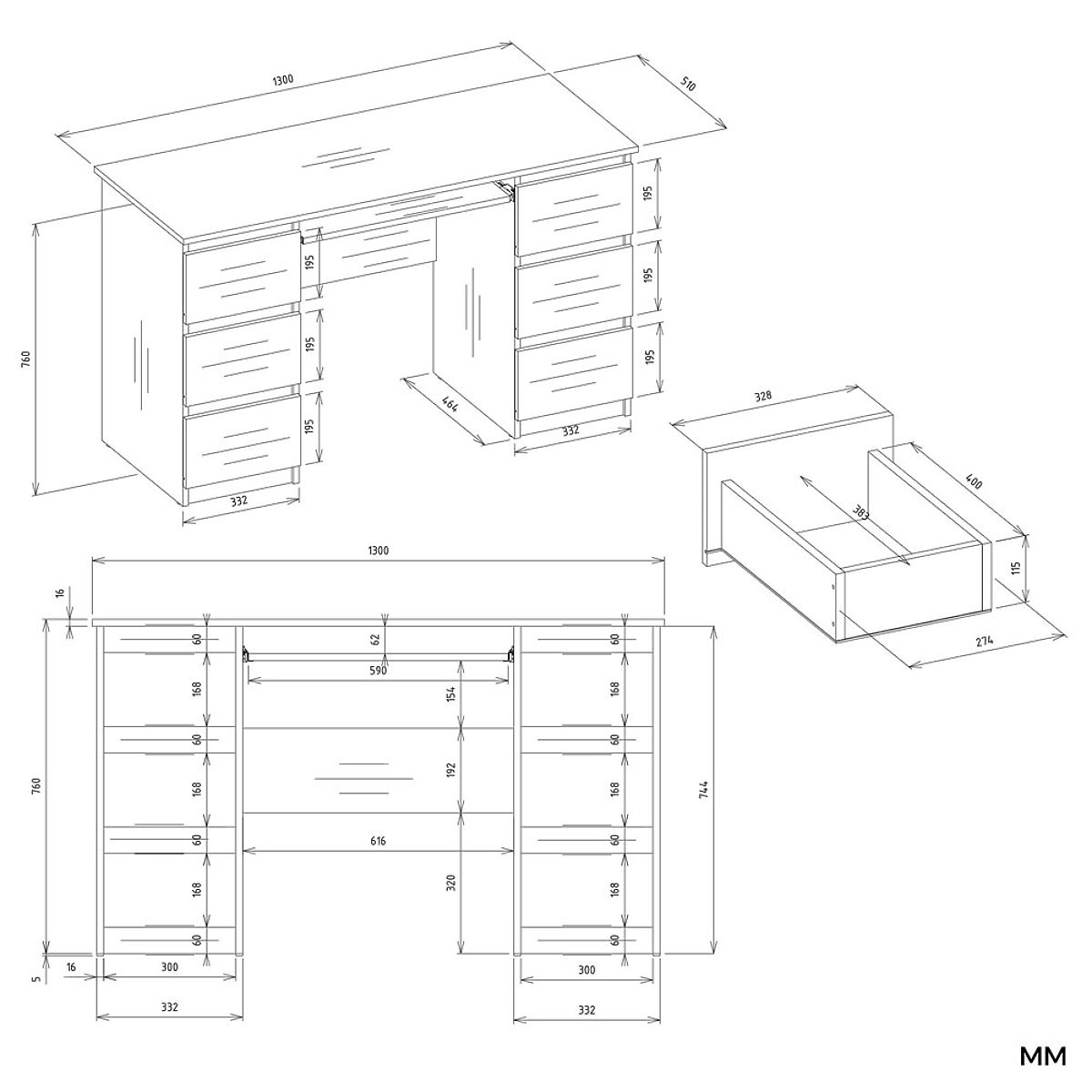 Komplet pohištva, zasnovan z mislijo na udobje pri delu in učinkovito organizacijo prostora. Pisalna miza "Kuba" v kombinaciji z ustrezno nadstavko ustvarja popoln prostor za učenje, pisarniško delo ali domačo uporabo. Estetska oblika, sodobna barvna shema in visoka funkcionalnost naredijo ta kos pohištva odlično izbiro za mladinsko sobo, pisarno ali delovni prostor.