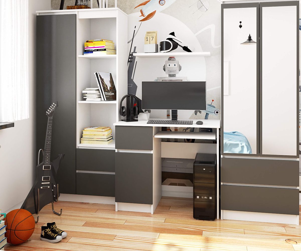 Računalniška miza PIKSEL bela/grafitno siva je odlična za uporabo v otroški, študentski sobi, ali v spalnici ali dnevni sobi, kjer je namenjen kotiček za delo od doma ali študij. Uporablja se lahko tudi v majhnih pisarniških prostorih, kjer se odlično ujema z drugim pohištvom v sistemu brez ročajev.