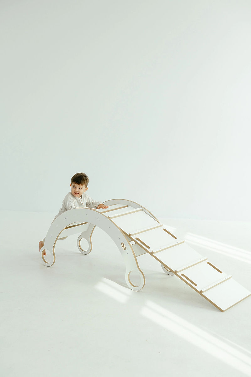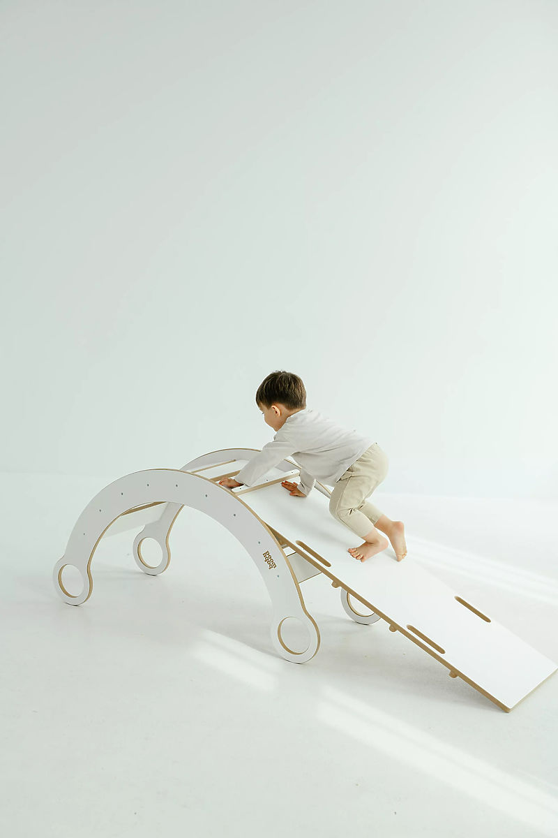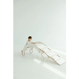 Elegantna lesena Montessori gugalnica s toboganom in lestvijo v beli barvi se odlično prilega vsaki otroški igralnici ali sobi. Ta večnamenski komplet ne ponuja le zabavnega guganja, temveč tudi možnost plezanja po lestvi in spuščanja po toboganu, kar naravno podpira razvoj motoričnih veščin, ravnotežja in moči otrok.