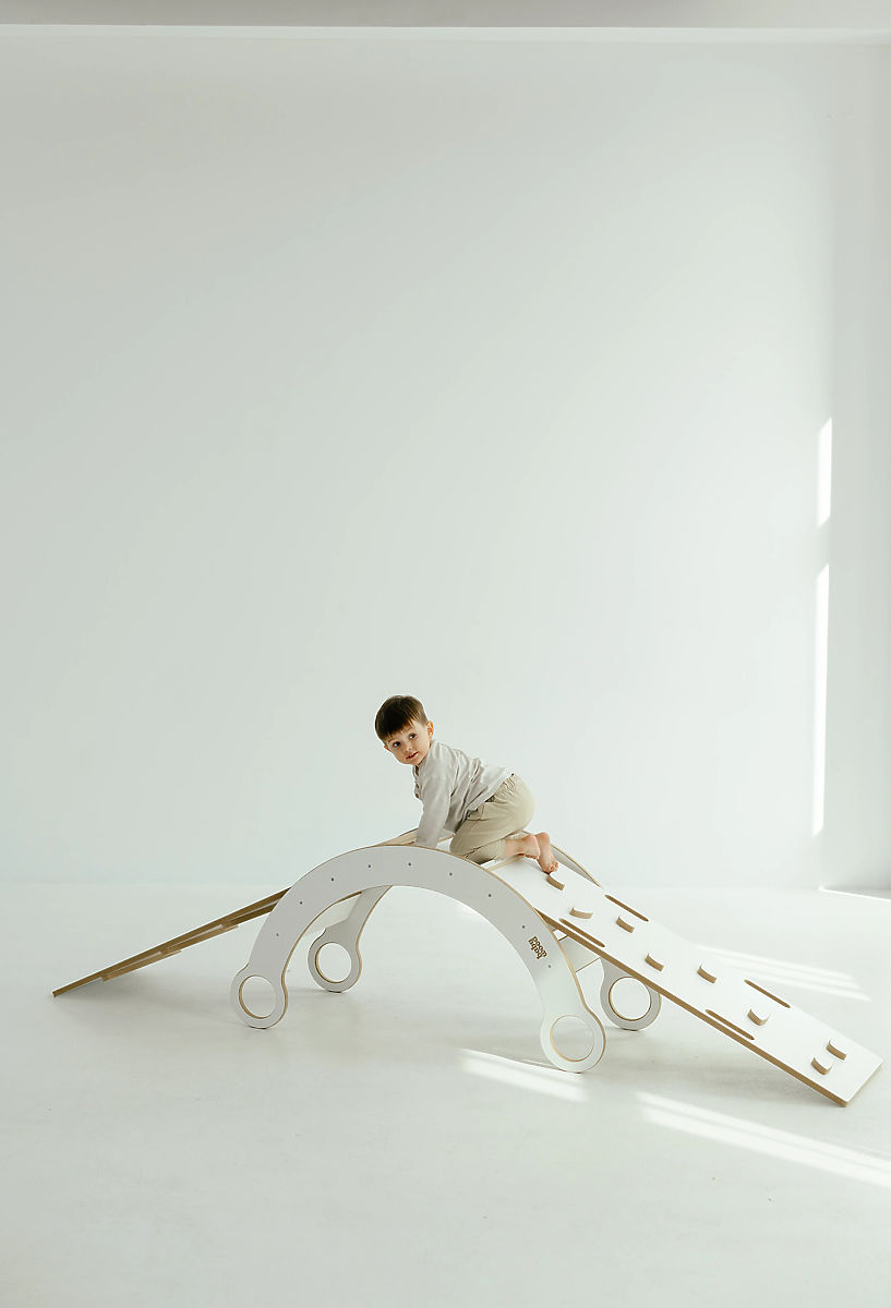 Z dodatnimi ploščami set ponuja še več igralnih možnosti. Ena stran plošče je gladka in služi kot tobogan, druga pa je opremljena s prečkami ali plezalnimi kamni, ki otroke motivirajo k plezanju in odkrivanju novih gibalnih veščin.