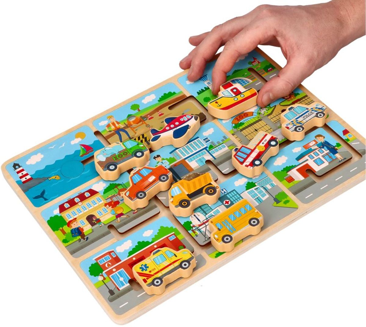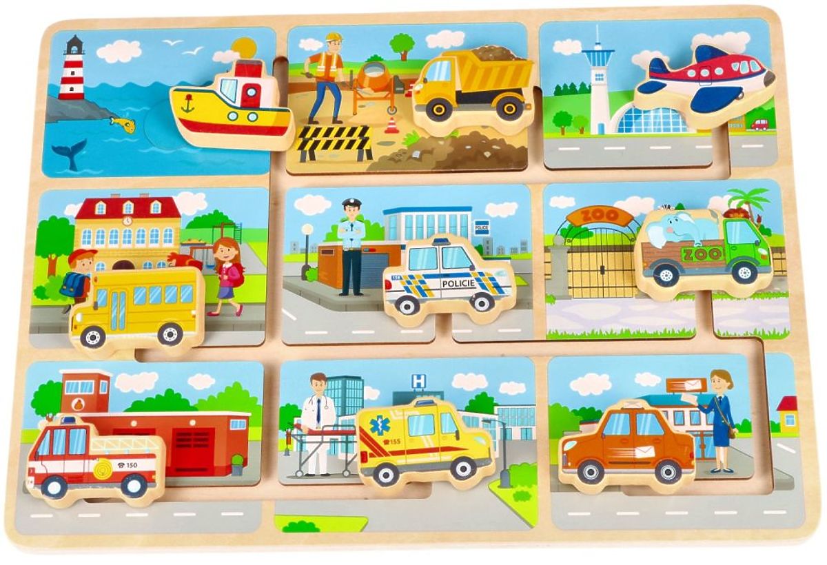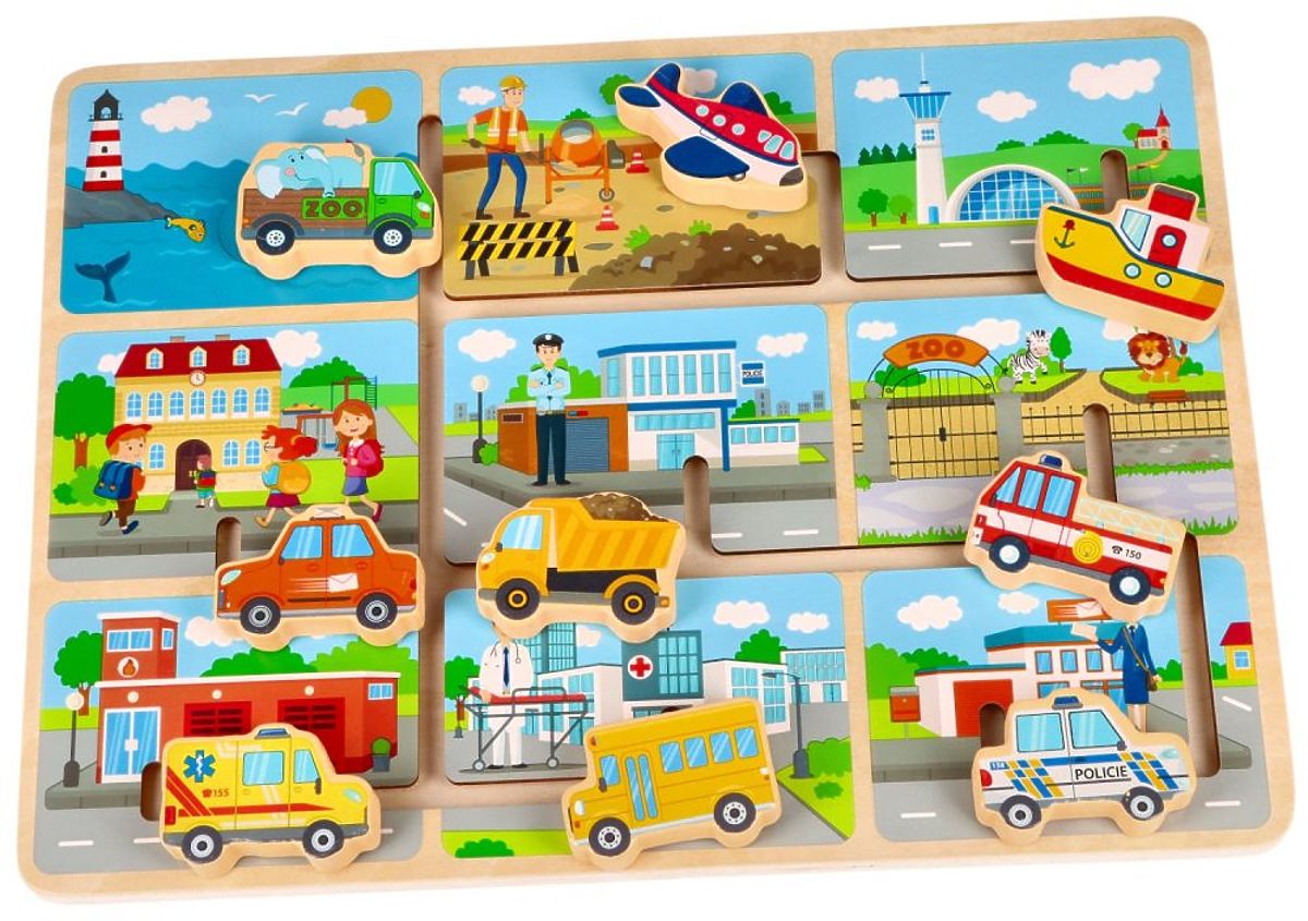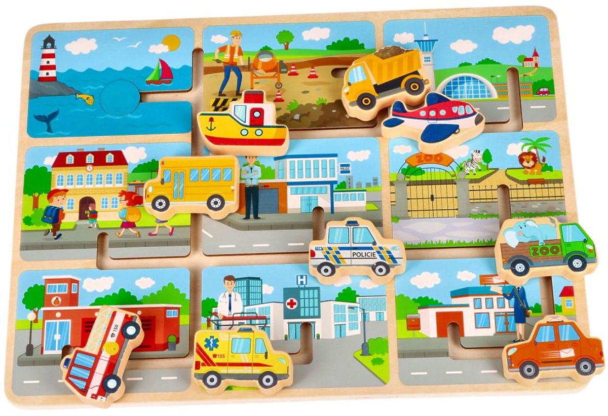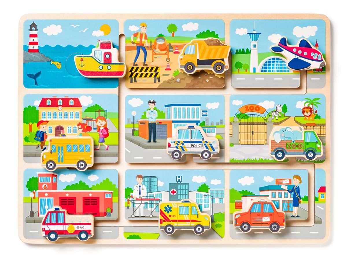 Sestavljanka je izdelana iz lesa. Na leseni osnovi je labirint in 9 vozil, ki jih je treba parkirati pod ustrezno stavbo. Tukaj najdete npr.: ladjo, letalo, tovornjak ali rešilca.