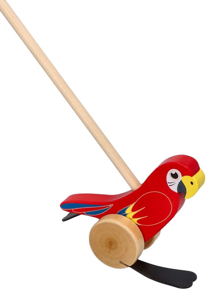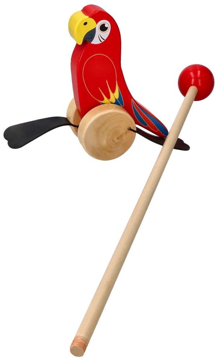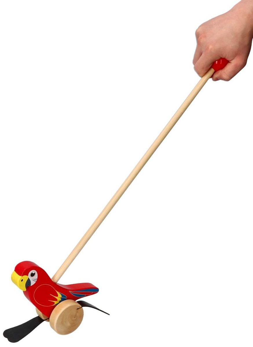 Predstavljamo idealnega spremljevalca za skupne sprehode. Vesel barviti Papagaj iz lesa je igrača, ki bo spodbujala otroka k gibanju in hoji. Otrok prime palico in potiska ptico pred seboj. Kolesa pri vrtenju povzročajo ploskanje gumijastih elementov ob tla. Palica je zaključena z ročajem, da je igrača udobna za potiskanje. Palica je privita.