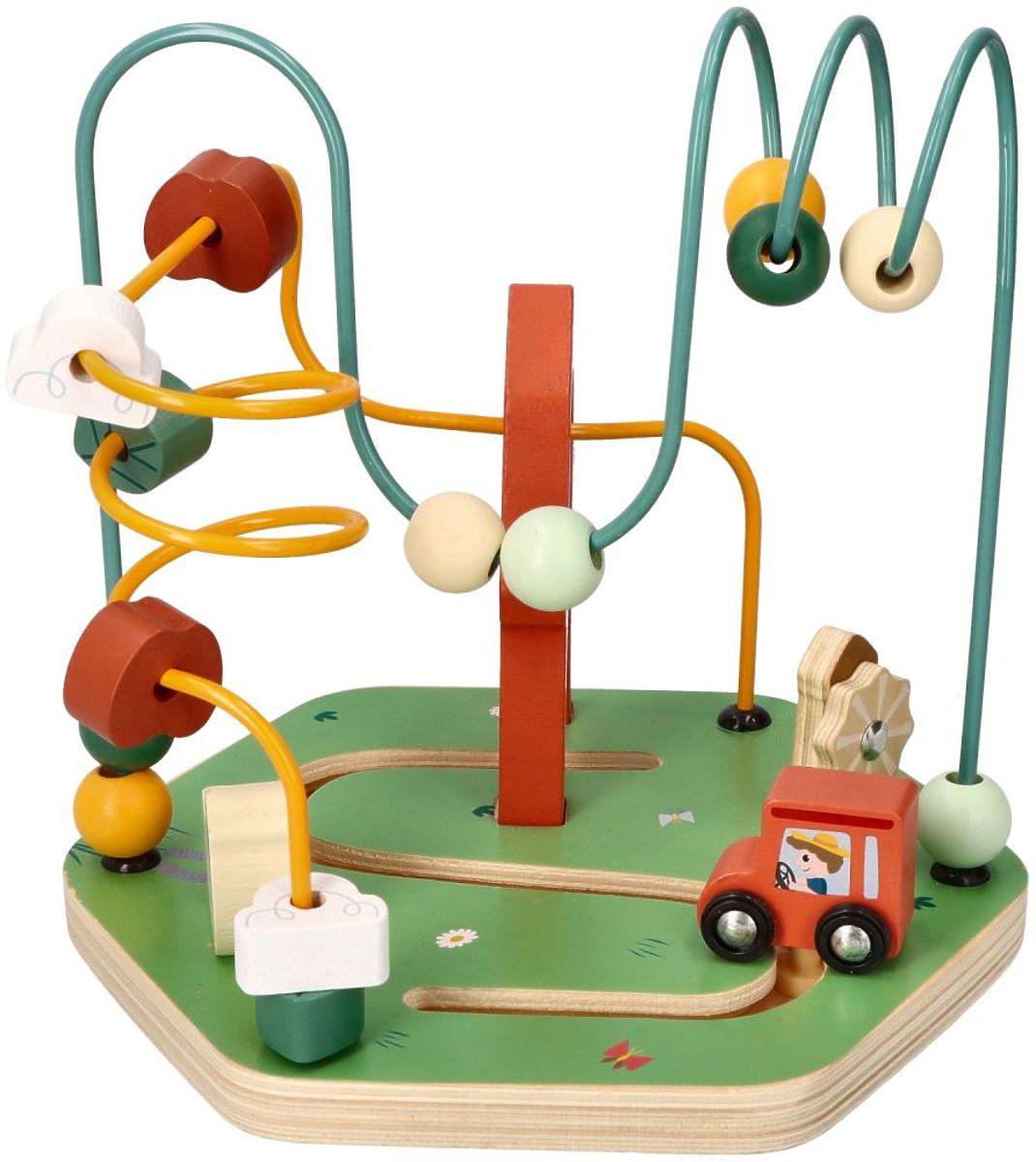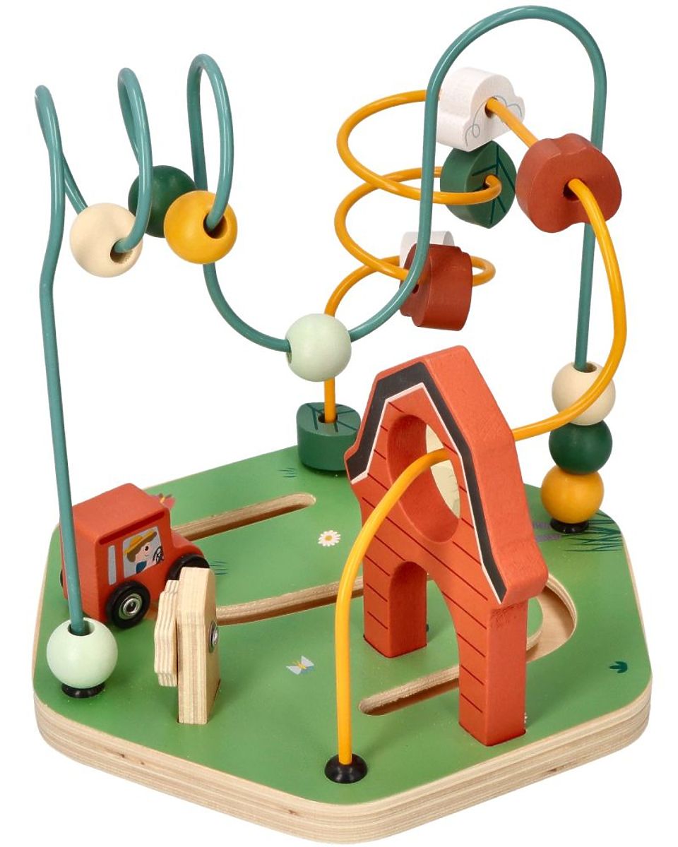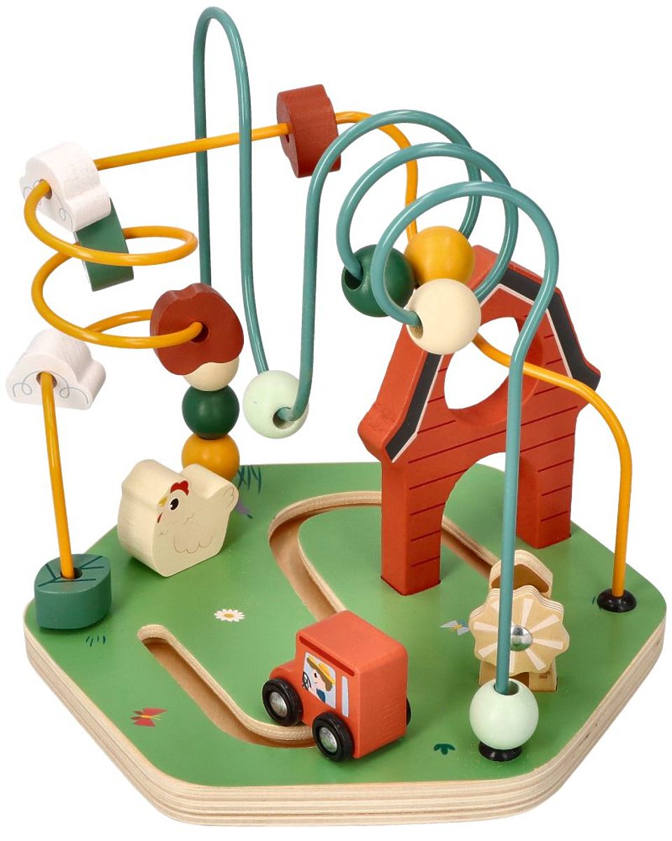 Na dveh kovinskih barvnih palicah (zelena, rumena) so lesene kroglice, ki jih lahko otrok poljubno premika, s čimer vadi natančnost gibov prstov in rok. Na zankah je skupno 14 lesenih kock in kroglic. Na eni izmed zank so ovire, ki nekoliko otežujejo nalogo premikanja kroglic. Poleg tega osnova igrače tvori pot, po kateri lahko novi lastnik – kot se spodobi za kmetijo – vozi traktor in varuje svojo lastnino. Skupaj tvori zelo barvito in veselo igračo, s katero bo otrok zagotovo užival prijeten čas.