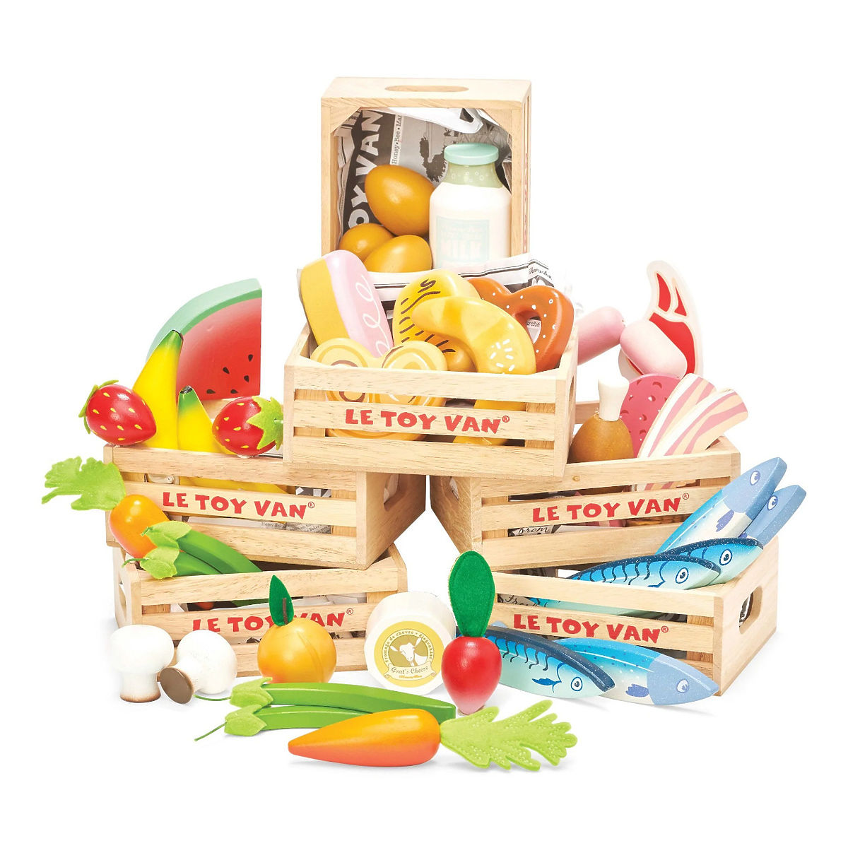 Nakupujte pametno! Lesen zaboj vsebuje sveže mleko, kocko masla, kozarec jogurta, škatlo smetane in 3 slastne sire za vse ljubitelje mlečnih izdelkov. Popoln dodatek za otroške stojnice in kuhinje. Prilega se drugim škatlam Le Toy Van, v katerih lahko najdete na primer ribe, zelenjavo, sadje, meso ali jajca. Glavne lastnosti: Lesen zaboj za sir in mlečne izdelke Združljiv z drugimi izdelki Honeybake - kuhinjska oprema, prodajna stojala Igrača spodbuja ustvarjalnost, domišljijo, pomaga pri razvoju govora in socialnih veščin Izdelana iz trpežnega in trajnostnega kavčukovega lesa - dolgotrajna zabava in skrb za naše planet Pobarvan z nestrupenimi barvami, testiran po najstrožjih standardih Kolekcija Honeybake Igrače v tej kolekciji so primerne za odkrivanje, otrokom bodo pomagale pri razvoju domišljije, socialnih in verbalnih spretnosti ter kognitivnih funkcij. Tradicionalna zasnova z modernimi detajli bo zagotovo zabava za otroke. Honeybake je kolekcija Le Toy Van, ki je prejela največ nagrad za dizajn, kakovost, varnost ter izobraževalno in igralno vrednost.