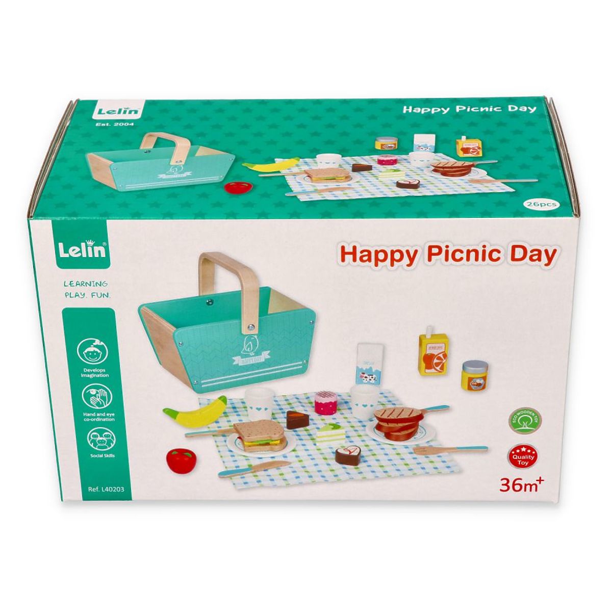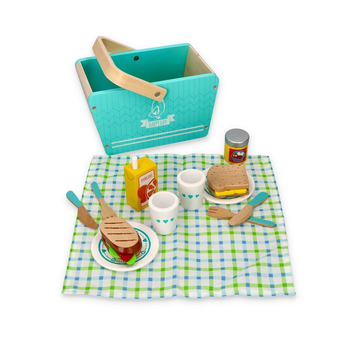 Celoten komplet je zapakiran v čudoviti košari, ki je v celoti iz lesa. Čudovita metina barva in tisk na strani dodajata čar. Prilegajoč prtiček, na katerem lahko razporedite elemente, je prav tako prednost tega izdelka. Povabite medvedke in prijateljice na skupni izlet iz mesta ali si priredite piknik v sobi, tudi če vreme ni primerno za taborjenje.