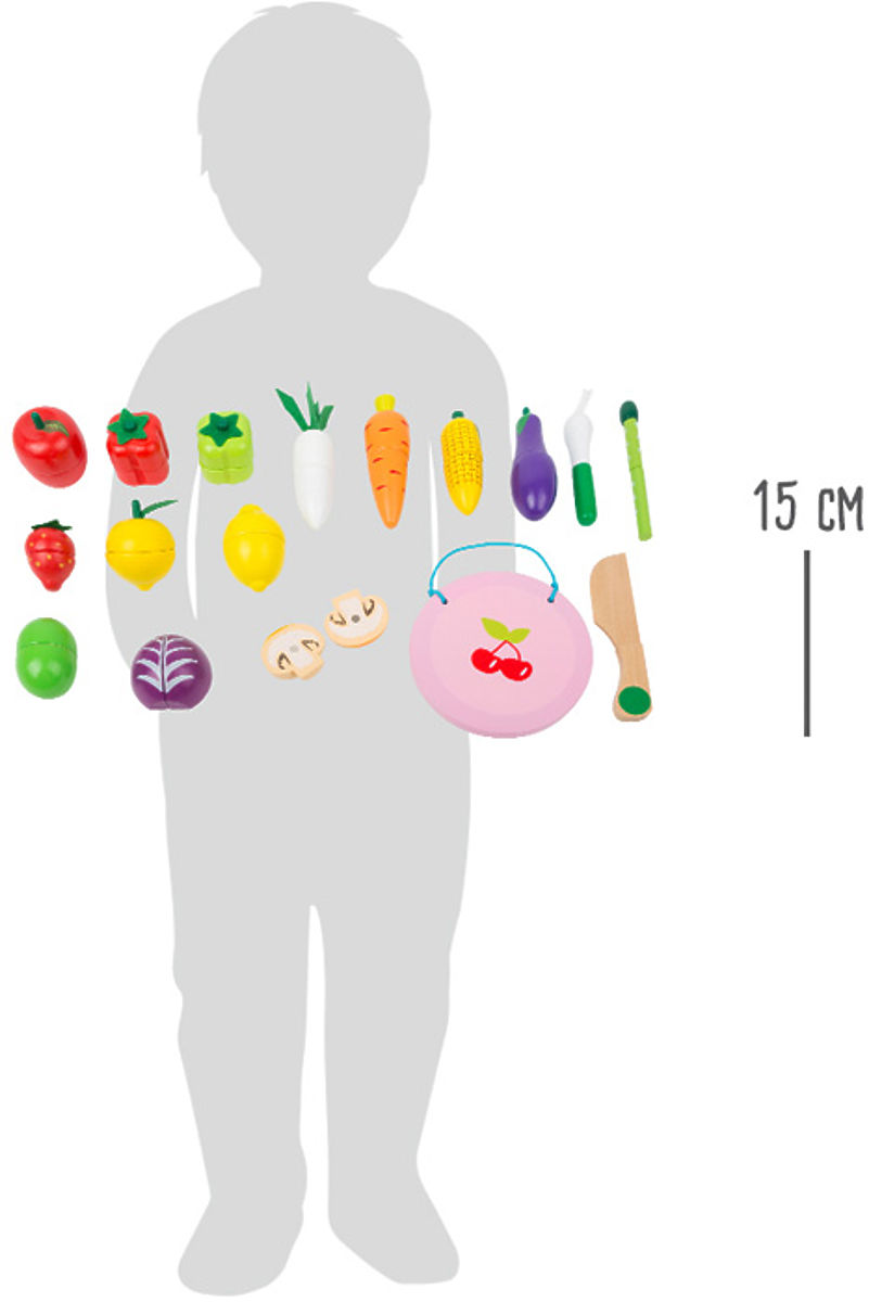 Poškodovana embalaža izdelka. Nov izdelek brez napak. Ta mešanica sadja in zelenjave ima veliko za ponuditi. Različne vrste sadja in zelenjave so pobarvane tako, da izgledajo kot prava hrana. Posamezni deli so povezani z ježkom (razen mlade čebule in špargljev). Igrača vsebuje nož za rezanje in leseno desko. Je okusna igralna izkušnja, ki spodbuja tudi ustvarjalnost in domišljijo. Vse je mogoče varno shraniti v praktični valjasti embalaži iz trde lepenke. Ta komplet je idealen dodatek otroškim kuhinjam in trgovinam. Glavne lastnosti: spodbuja ustvarjalnost in domišljijo, idealen tudi za potovanja.