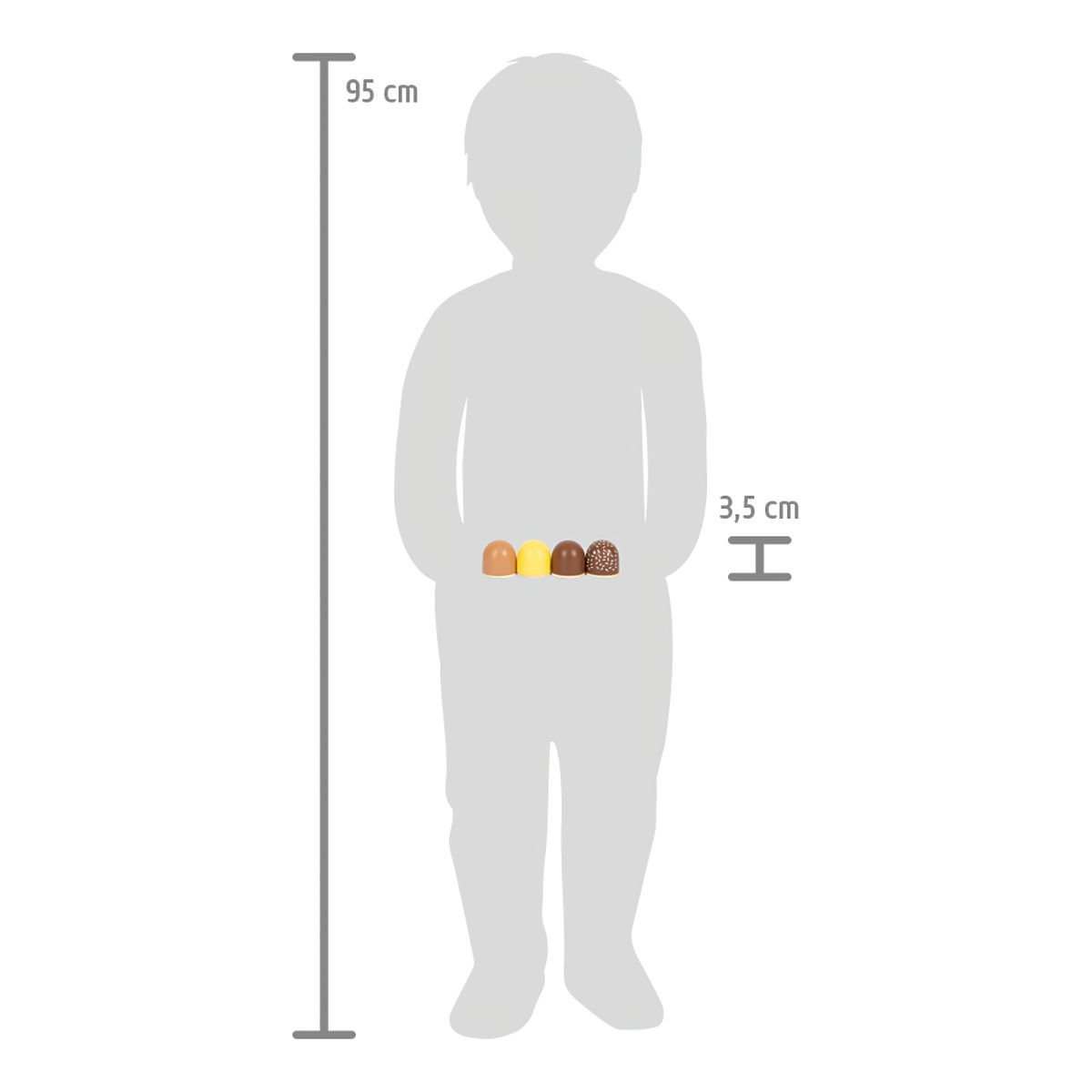 Za male sladokusce! Te štiri sladke praline z marshmallowom znotraj so narejene iz lesa in se bodo odlično prilegale otroškim prodajnim stojnicam in kuhinjam. V paketu so štiri različice: bela čokolada, temna čokolada, temna čokolada s posipom in mlečna čokolada. Njihov naravni videz bo navdušil otroke prav tako kot njihova eko kartonska embalaža. Praline z marshmallowom izgledajo kot prave in bodo otrokom služile pri domišljijski igri trgovine, piknika, čokoladnice... V kombinaciji z drugimi izdelki iz linije "Fresh" bodo uživali v pravi zabavi. Glavne značilnosti: štiri čokoladne praline iz lesa, bela čokolada, temna čokolada, temna čokolada s posipom, mlečna čokolada, realističen dizajn za domišljijsko igro, neobdelan karton, iz katerega je praline enostavno izvleči, združljivo z drugimi izdelki iz linije "Fresh"