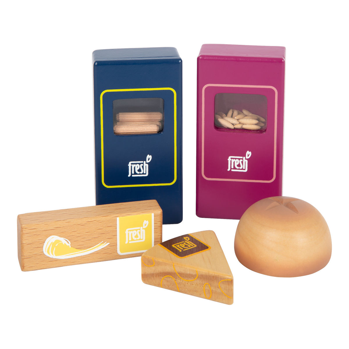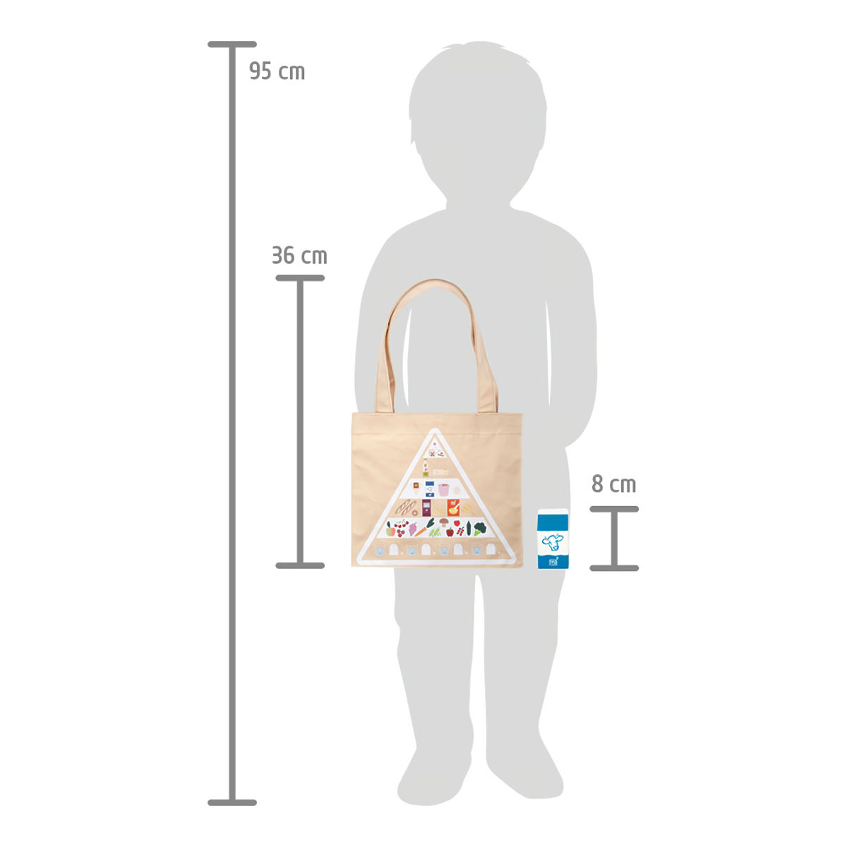 Brezmesne jedi v otroški kuhinji! Ta obsežen komplet domišljijskih lesenih živil bo otroke navdušil za realistično igro vlog na temo uravnotežene vegetarijanske prehrane. Pakiranje riža in testenin ima okence, bombažna torba je potiskana s prehransko piramido – otroci se bodo preprosto naučili o pravilni prehrani! Mleko, maslo, sir, olje, jajca, riž, testenine, pekovski izdelki, jabolko, paradižnik, kumara in korenje. Širok izbor vegetarijanskih živil, ki se bodo popolnoma prilegala otroškim kuhinjam in prodajnim stojnicam. Steklenica vode in čajna vrečka lepo dopolnjujeta ta komplet. Glavne značilnosti: leseni komplet živil na temo uravnotežene in vegetarijanske prehrane, v pakiranju bombažna torba potiskana s prehransko piramido, obsežen komplet vegetarijanskih živil: mleko, maslo, sir, olje, jajca, riž, testenine, pekovski izdelki, jabolko, paradižnik, kumara, korenje, lesena steklenica vode, čajna vrečka iz lesa in klobučevine, realistično pakiranje testenin in riža s pleksi steklom (pri tresenju embalaža oddaja zvok), otroci se bodo na zabaven način naučili o prehranskih navadah, pakirano v ponovno uporabni embalaži, otroci se bodo pri igri naučili nekaj novega o ekologiji, živilom bodo preprosto razumeli tudi najmlajši otroci, združljivo z drugimi izdelki iz serije „Fresh“