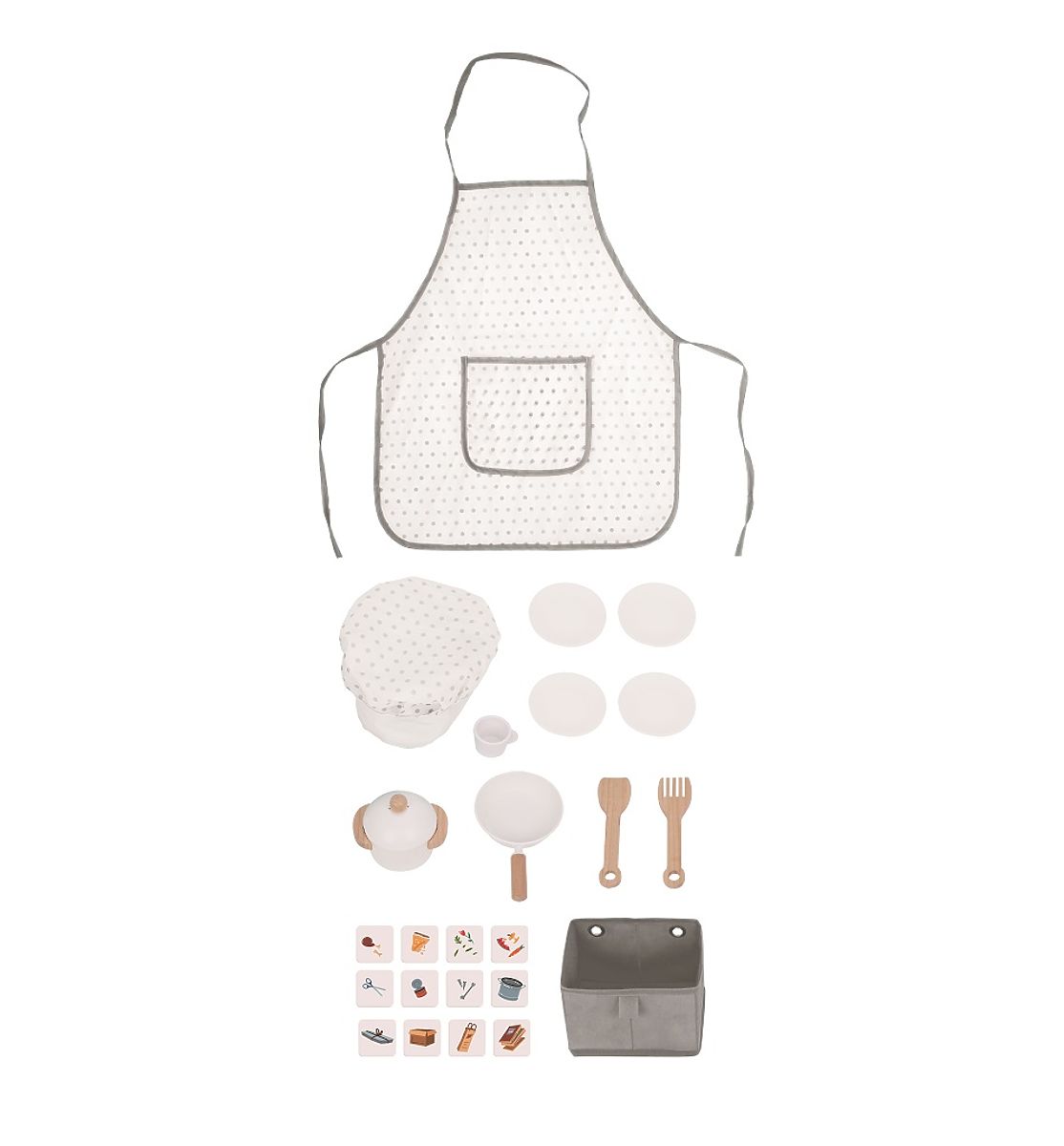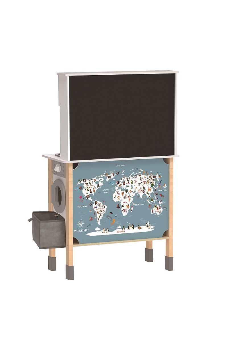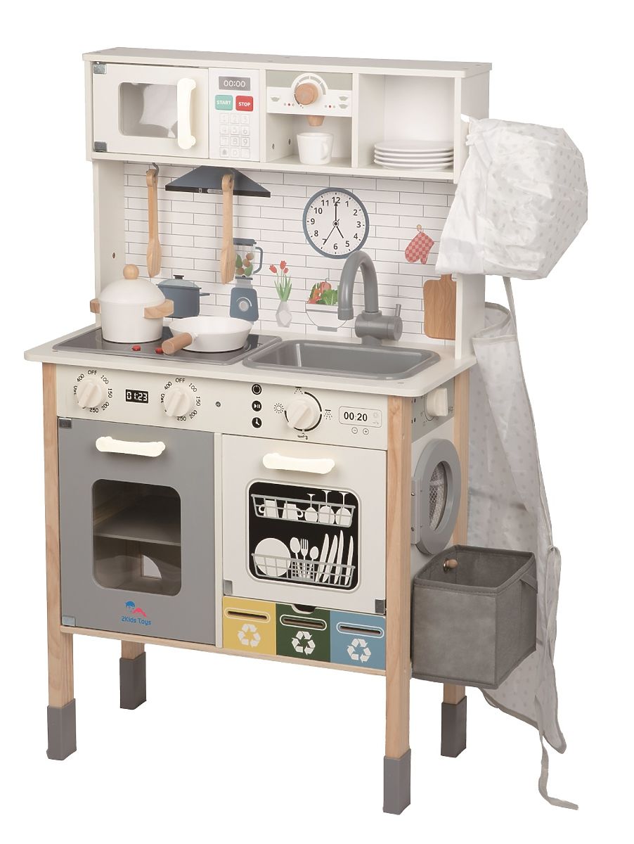 Bi radi svež kolaček neposredno iz pečice? Ali pa vas mika nekaj ocvrtega? S to kuhinjo lahko imate meni po svoji želji. Je namreč popolnoma opremljena! Najdete vse, kar v nobeni sodobni kuhinji ne sme manjkati - štedilnik s pečico, pomivalni stroj, mikrovalovno pečico, pomivalno korito, kavni aparat in seveda posodo z orodjem, kot so krožniki, lonec, ponev, skodelica in drugo. Na bočni strani kuhinje je nameščen pralni stroj, iz katerega lahko oprano perilo shranite v visečo odstranljivo košaro. Tudi zadnja stran kuhinje ni ostala neizkoriščena. Na praktično črno tablo lahko otroci napišejo sporočilo, zapišejo sestavine receptov ali kaj narišejo. Kot navdih jim lahko služi zabavna karta z živalmi, ki je prav tako zadaj. Tako si nadenite kuharsko kapo, oblecite praktično predpasnik in lahko začnete kuhati. Ker nam je mar za planet Zemljo, ne smemo pozabiti na koše za ločevanje! Glavne lastnosti: vključuje bogato dodatno opremo, večfunkcijsko, raznovrstna uporaba, razvija komunikacijske in socialne veščine, izdelano iz lesa s certifikatom FSC® Znamka in certifikat FSC® (Forest Stewardship Council) zagotavlja, da les, iz katerega je izdelek izdelan, ni bil nezakonito posekan in izvira iz gozdov, ki so upravljani na okolju prijazen ali naravi bližnji način, v katerem so upoštevane stroge okoljske in socialne zahteve. Znamka FSC® na izdelku pomeni, da s svojim nakupom pomagate varovati gozdove in podpirate okolju prijazno, odgovorno ali naravi bližnje gospodarjenje, zaradi katerega so naši gozdovi stabilnejši, bolj zdravi, imajo naravno vrstno sestavo in se bolje upirajo negativnim posledicam podnebnih sprememb.