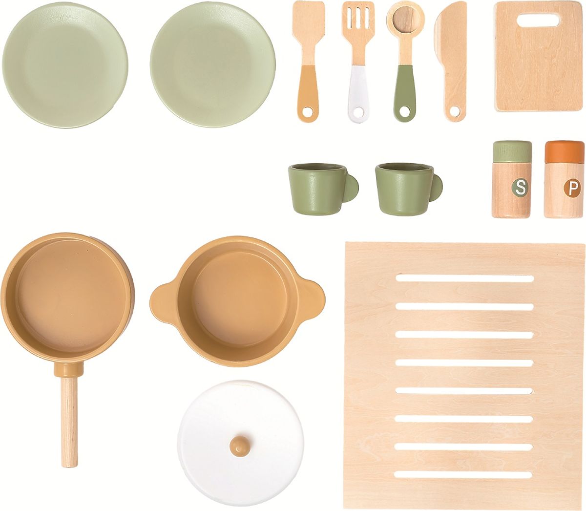 Bi radi topel domač kolaček? Ali pa morda imate željo po nečem ocvrtem? S to kuhinjo lahko imate meni po svoji želji. Je namreč popolnoma opremljena! Tukaj boste našli vse, kar v moderni kuhinji ne sme manjkati - štedilnik s pečico, izdelovalec ledu, mikrovalovno pečico, pomivalno korito, aparat za kavo in seveda posodo z orodjem, kot so krožniki, lonec, ponev, skodelice, nož, zajemalka in drugo. Zahvaljujoč vratom, ki se odpirajo, in vrtljivim gumbom je užitek v igri še bolj realističen. Vse je izdelano iz kakovostnega trdnega lesa in obdelano z netoksičnimi barvami. Tako si nadenite kuharsko kapo, oblecite predpasnik in začnite kuhati! Vsebina paketa: 2x krožnik, 2x skodelica, 1x ponev, 1x lonec, 1x pokrov, 1x poper, 1x sol, 1x deska, 4 kosi orodja, rešetka za pečico. Glavne lastnosti: vključuje bogato opremo, multifunkcionalna, raznolika uporaba, razvija komunikacijske in socialne veščine, spodbuja k domišljijski igri, primerno za otroke do 3 let