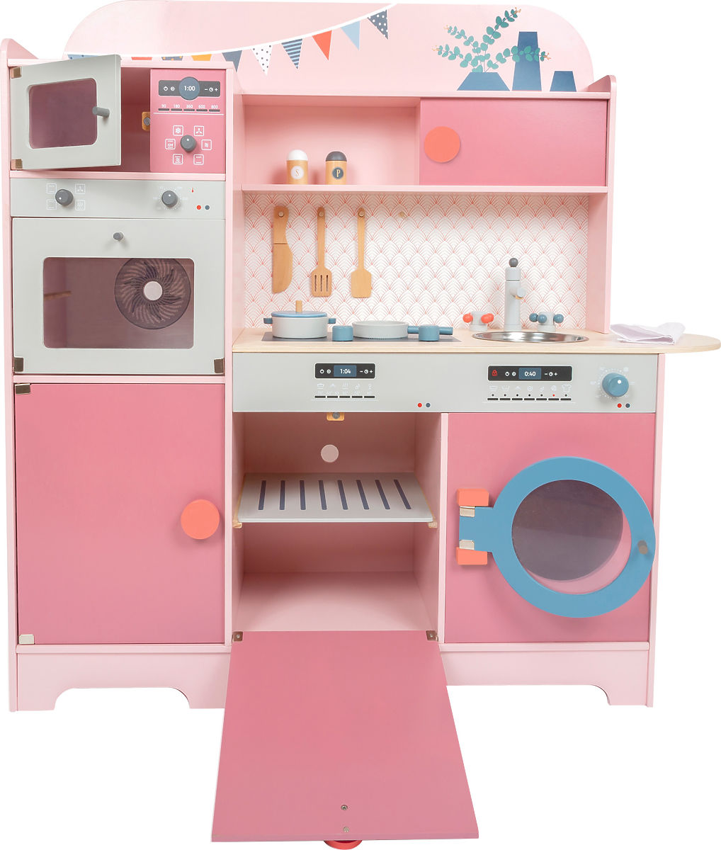 S to kuhinjo je Michelinova zvezda vaša! Ta otroška lesena kuhinja v modernem roza retro videzu s štedilnikom, umivalnikom, pralnim strojem, pomivalnim strojem, hladilnikom, mikrovalovno in ventilatorsko pečico je kot nalašč za dolge ure zabave. Gumbi klikajo in vrata naprav se odpirajo. Dobavljeno vključno s servirnim priborom, loncem, ponevjo, solnico in poprovko. Glavne značilnosti: številne naprave, vrata z magnetnim zapiranjem in klikajočimi številčnicami, realistično ilustrirane nadzorne plošče naprav, vključuje majhen komplet dodatkov za kuhanje, prostor za shranjevanje, spodbuja aktivno igranje vlog in socialne veščine.