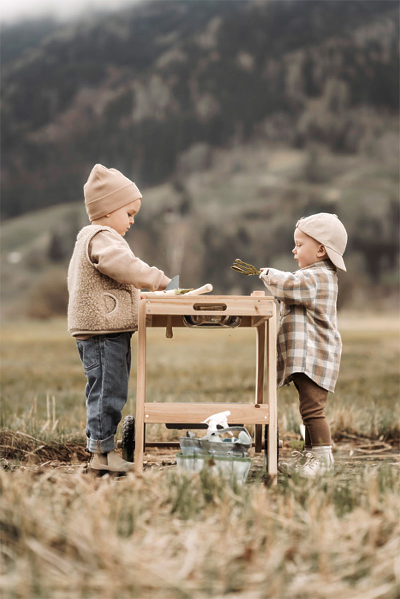 Izpiranje, kuhanje in gradnja iz vode in peska! Ta zunanja "poletna" kuhinjica za igro je idealna za majhen vrt, teraso ali balkon. Kljub kompaktnim dimenzijam kuhinjica ponuja dovolj prostora za ustvarjalno igro. Dobavlja se z dvema odstranljivima posodama, ki lahko sprožita celoten gradbeni in kulinarični proces. Kuhalna plošča je opremljena z vrtljivimi gumbi in vrsto odprtin, ki lahko služijo na primer kot odprtina za vodno cev. Zahvaljujoč robustnim kolesom je kuhinjico enostavno premikati. Primerna je kot dodatek ali alternativa peskovniku za izdelavo najlepših "peščenih" kolačkov in drugih dobrot. Glavne značilnosti: idealna za majhen vrt, teraso ali balkon, praktične vgrajene odprtine za igrače za pesek ali vodno cev, opremljena s kolesi, enostavno premakljiva, neobdelan les primeren za osebne prilagoditve in lakiranje