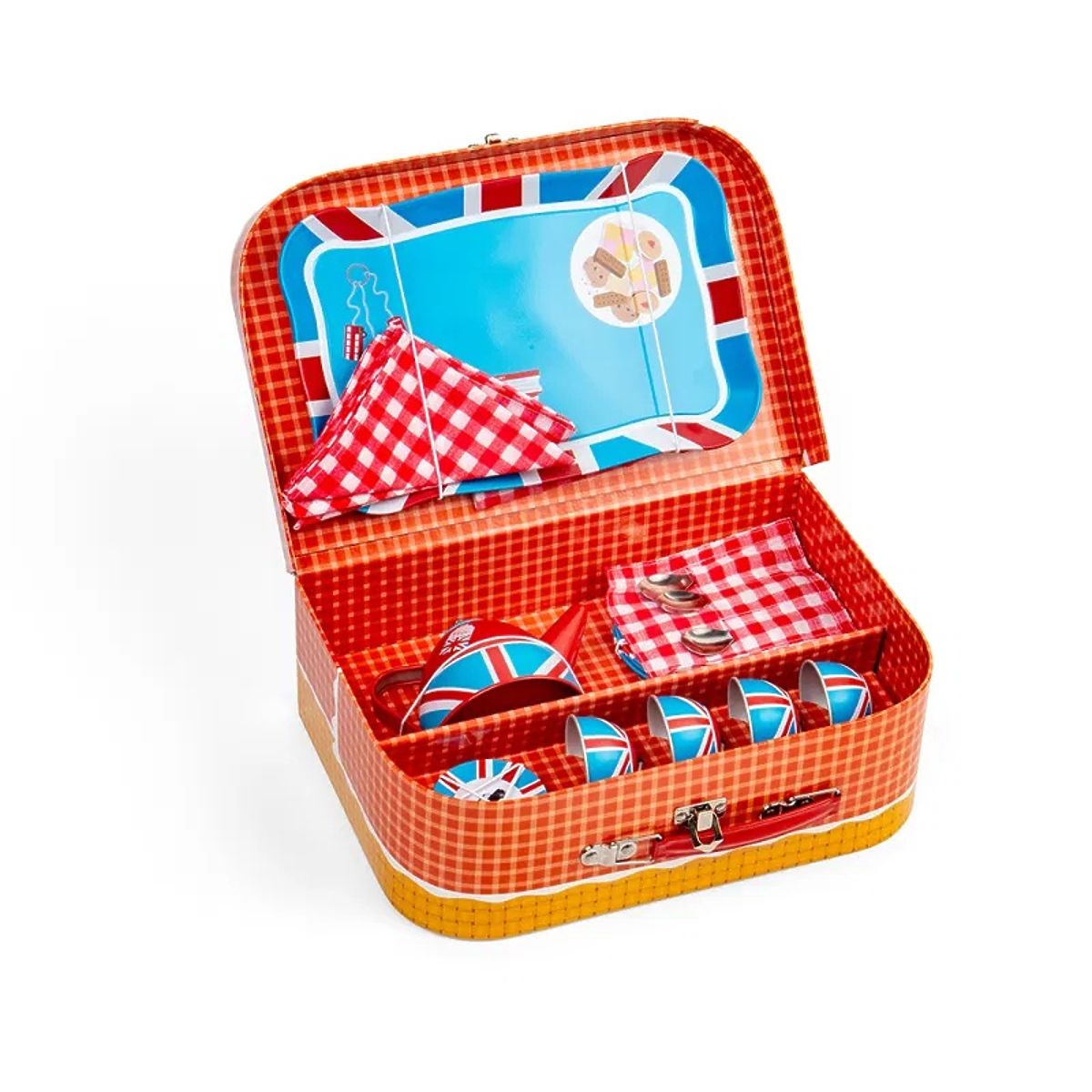 Bi radi pravi angleški čaj? Povabite svoje plišaste prijatelje ali punčke na popoln popoldanski čaj! V kovčku s prikupnimi ilustracijami z londonskimi motivi boste našli vse potrebno za vaše goste: pladenj, komplet 4 kovinskih skodelic s krožniki, 4 žličke, 4 krožnike, čajnik s pokrovom, piknik odejo in serviete v barvah in z motivi britanske zastave. Kovček je opremljen s praktičnim ročajem za prenašanje, da lahko otroci uživajo v pikniku tudi pri prijateljih ali v naravi. Čajni set, zasnovan za domiselno igro vlog, spodbuja ustvarjalnost in vabi k pripovedovanju zgodb, navdihnjenih z življenjem v velikem mestu, kot je London. Igra vlog je odlična tudi za socialni razvoj, komunikacijo, razvijanje jezikovnih spretnosti in samozavest otrok. Set je izdelan iz materialov vrhunske kakovosti in iz odgovornih virov ter je pobarvan z netoksičnimi barvami in laki. Ustreza trenutnim evropskim varnostnim standardom. Glavne lastnosti: 24 delov v praktičnem kovčku z ročajem, razvija socialno inteligenco, jezikovne sposobnosti, kreativno razmišljanje in komunikacijske spretnosti, izboljšuje fino motoriko in koordinacijo roka-oko, spodbuja igro vlog, izdelano iz visokokakovostnih materialov, primerno od 3. leta starosti