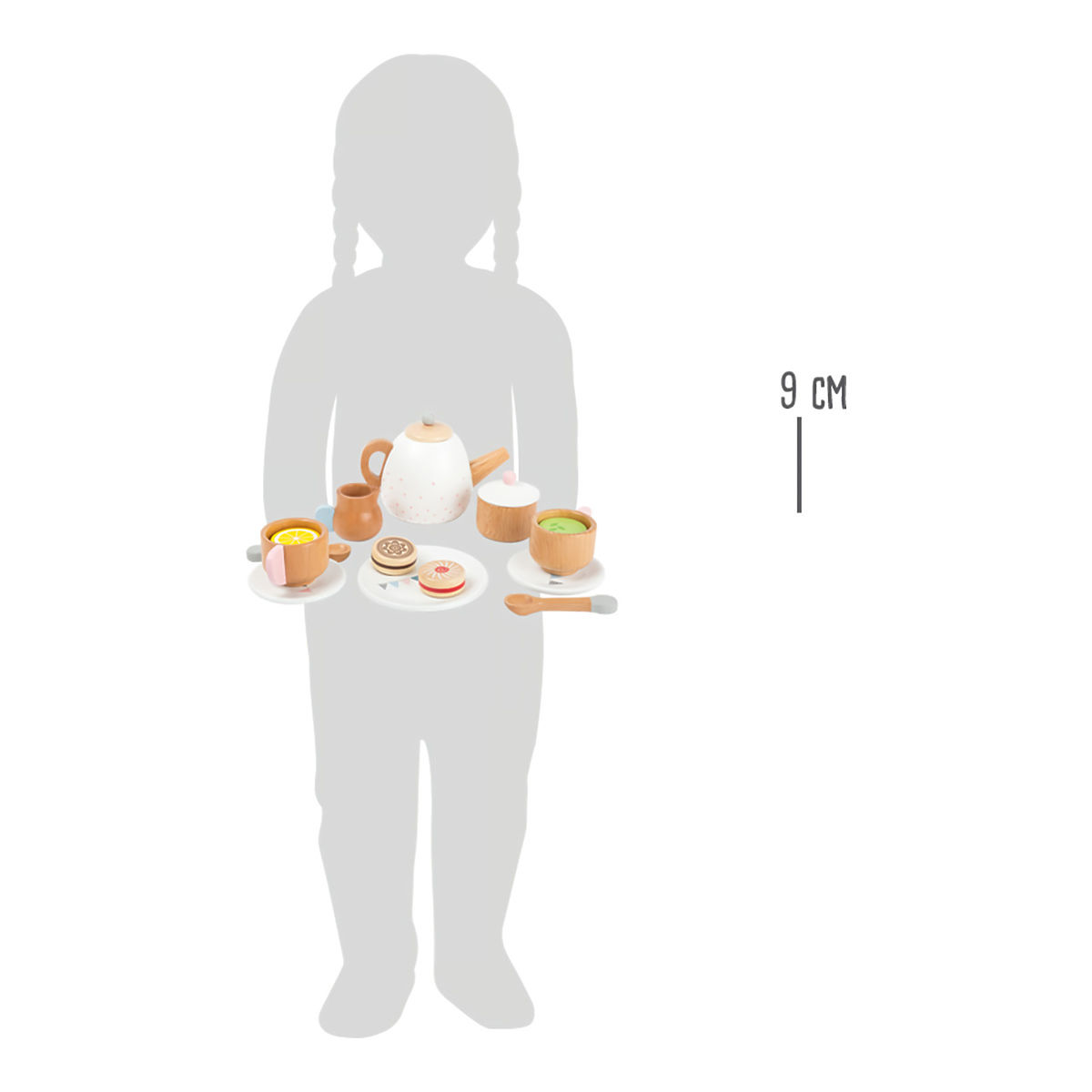 Presenetil vas bo s skrbno obdelavo masivnega lesa, sestavni deli so robustni in posebej prilagojeni otroškim rokam. Naravni material je spretno prepoznan in igrivo kombiniran z nežnimi pastelnimi odtenki. Dizajn poudarja detajle, pokrova čajnika in sladkornice sta zato odstranljiva in igra je lahko še bolj verjetna. S setom lahko primerno dopolnite otroško kuhinjo, stojalo ali makete sladic.