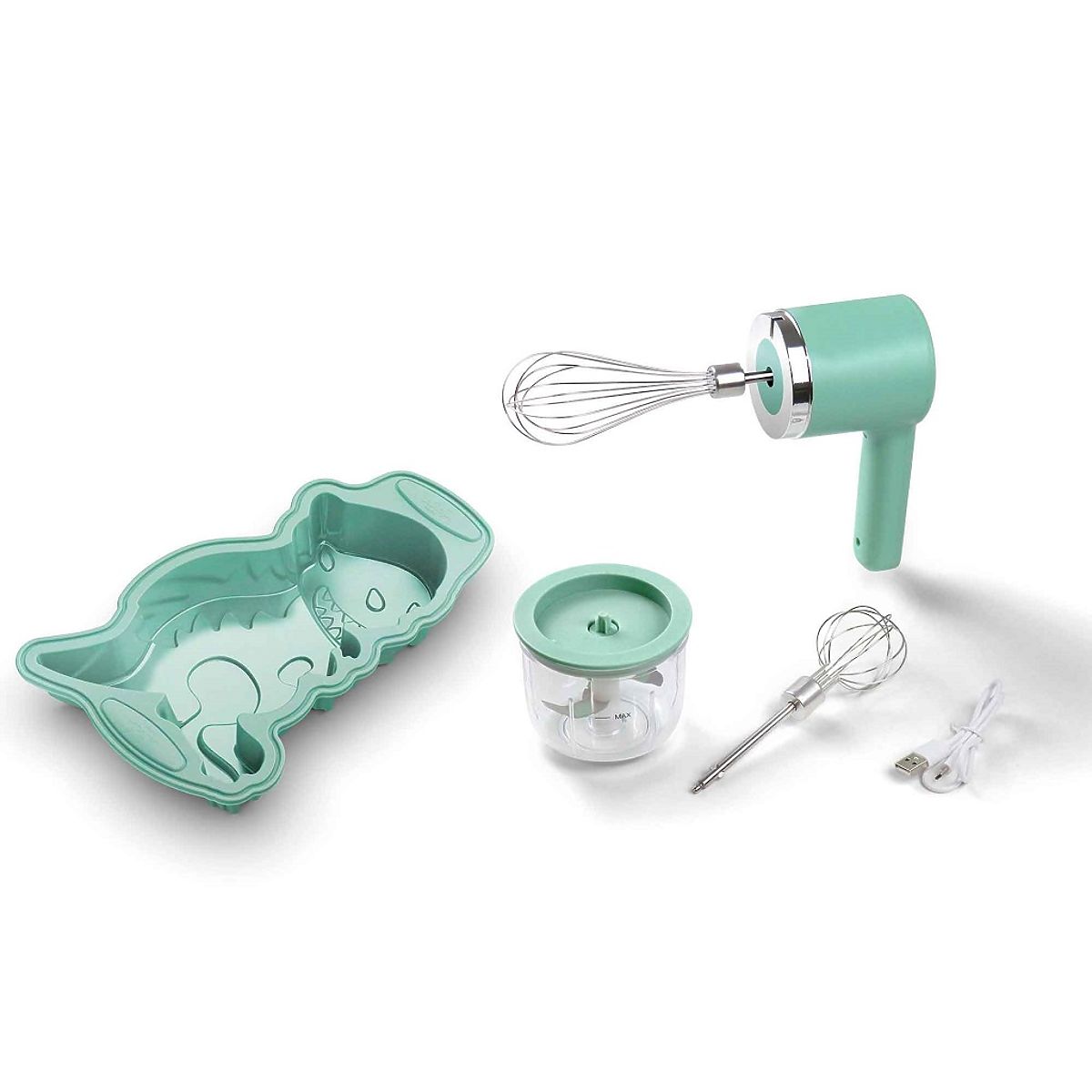 Ali vaši otroci radi preživljajo čas v kuhinji in želijo biti samostojni? S tem setom 3v1 lahko. Set orodij za peko je prava izbira za male kuharje. Vključuje ročni mešalnik, sekljalnik in silikonski model za peko. Vsak element tega seta je zasnovan s poudarkom na praktičnosti in enostavni uporabi. Mešalnik in sekljalnik sta lahka, tako da ju otroci brez težav nosijo in držijo. AKU ročni mešalnik z 2 nastavkoma ima 5 hitrosti. Sekljalnik s prostornino 300 ml. Silikonski model v obliki dinozavra je nelepljiv in prilagodljiv. Model prenese ekstremne temperature: do 230 °C in -40°C, zato je primeren za pečico in tudi na primer za zamrzovalnik. Dimenzije modela so 27x17x6 cm, kapaciteta 950 ml. Brez BPA. Enostavno polnjenje s pomočjo USB kabla. USB kabel je priložen. Ta aparat lahko uporabljajo otroci, če so pod nadzorom odrasle osebe ali so bili poučeni o varni uporabi aparata in razumejo morebitne nevarnosti. Glavne lastnosti: 3v1 v enem olajša pripravo različnih jedi odličen pomočnik v kuhinji