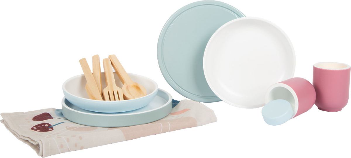 Moderna jedilna garnitura, ki vključuje krožnike, skodelice, jedilni pribor in pogrinjke za dve osebi. Visokokakovostna izdelava iz robustnega in trpežnega lesa, ki je zasnovan tako, da vam bo dolgo služil. Ponuja dodatne učne učinke s tiskanimi pogrinjki, ki prikazujejo, kako pravilno pogrniti mizo. Sodobni videz z linearnimi oblikami in kombinacijo naravnega lesa s trendovskimi barvami dimno modre in jagodno rdeče. Popolna harmonija barve in dizajna s kolekcijo Tasty, kjer najdete otroško kuhinjo in druge kuhinjske izdelke. Za posebej realistično zabavo pri igri vlog v otroški kuhinji. Podpira razvoj fine motorike, socialnih veščin in drugih vsakodnevnih veščin. Zaradi uravnoteženega dizajna in sodobne barvne sheme se še posebej dobro prilega v moderno okolje otroške ali dnevne sobe. Glavne lastnosti: Podpira razvoj fine motorike in socialnih veščin Vsebuje 12 delov