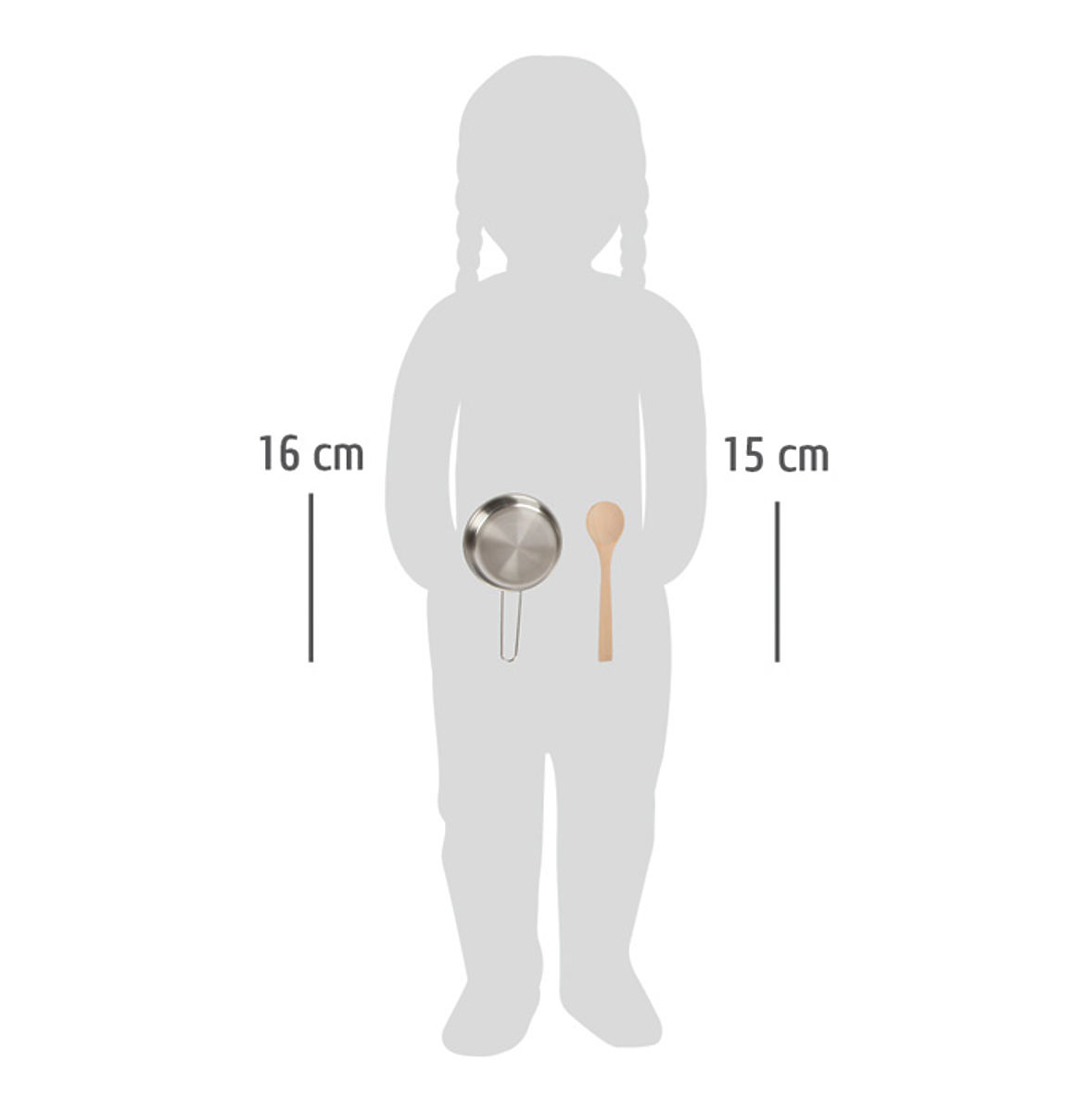 Obsežen komplet za kuhanje vsebuje lonec s pokrovom, ponev, metlico, lopatico in leseno kuhalnico. V paketu je tudi otroški predpasnik, podstavek za lonec in .. več