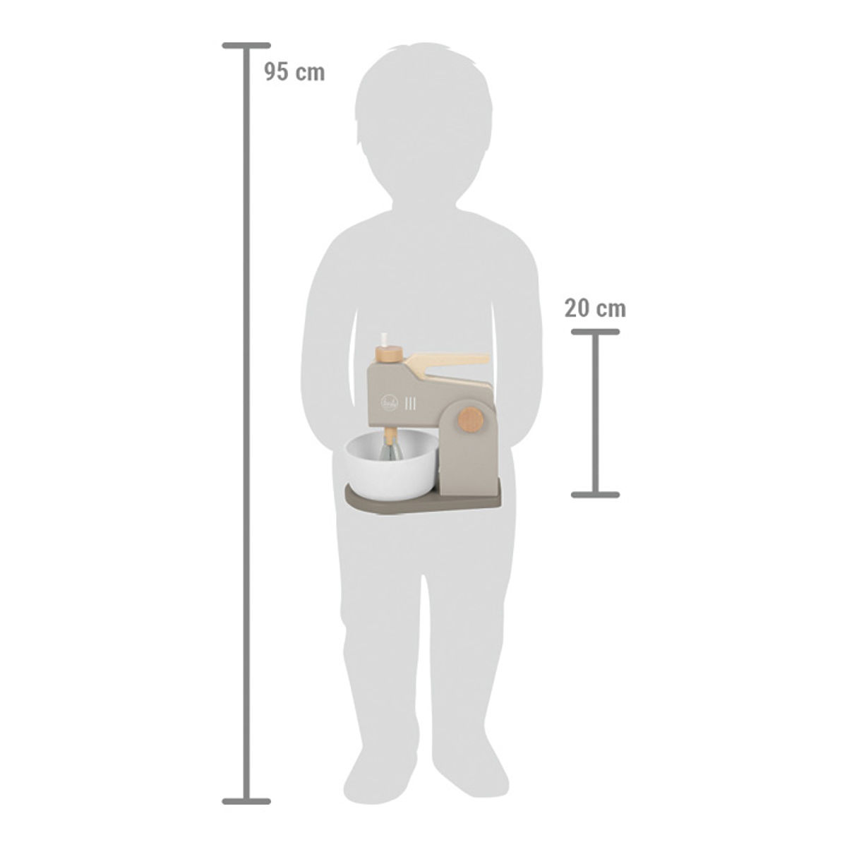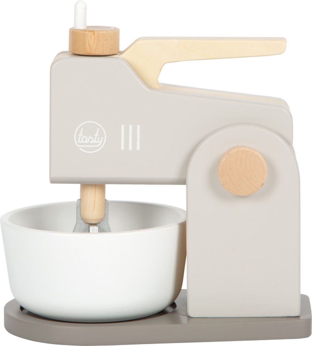 S tem lesenim setom mešalnika v topli sivi barvi z veliko naravnega lesa bodo mali peki in pekarice v svoji kuhinji odlično opremljeni. 2 v 1! Ročni mešalnik se lahko pritrdi na podstavek mešalnika in se v trenutku spremeni v sodoben kuhinjski robot. Metlica še povečuje realističnost igre, saj jo je mogoče vrteti s pomočjo ročajev. Seveda ne manjka niti lesena posoda, v kateri je treba zmešati pravo testo. Zložljiva mešalna glava, ki jo je mogoče dvigniti navzgor, omogoča enostavno odstranitev posode. Mešalnik ima stabilno osnovo zahvaljujoč podstavku. Glavne značilnosti: 2 v 1, idealen dodatek za otroške kuhinje, stabilna izvedba, razvoj socialnih veščin, uravnotežena zasnova in moderne barve, primeren za druge izdelke iz linije Tasty.