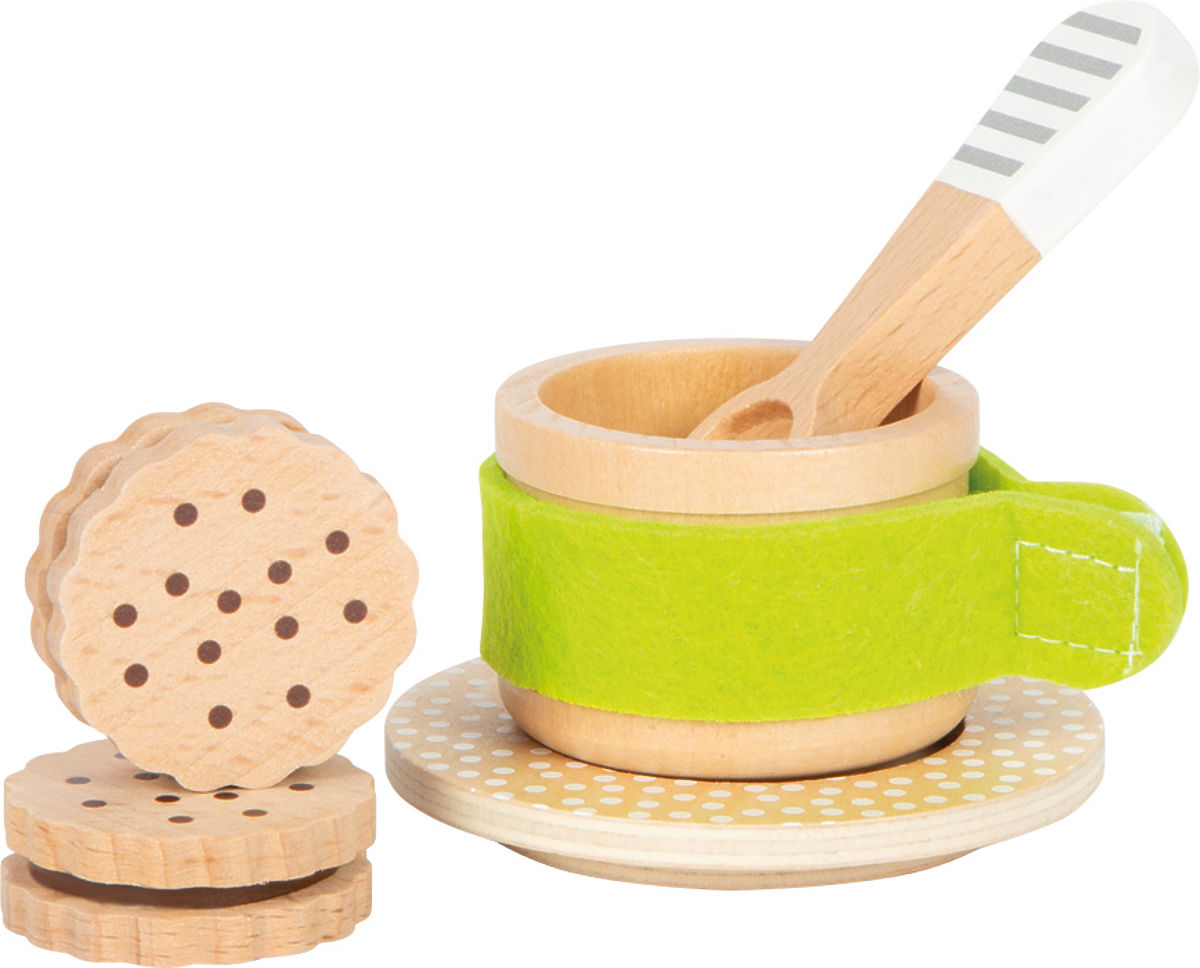 Vsi prijatelji čaja in ljubitelji kave, pozor. Ta set je zasnovan z mislijo na najmlajše gostitelje, ki radi posnemajo odrasle pri pripravi kave in čaja. Set ima čudovit dizajn, zanimive podrobnosti, veliko lesenih materialov in haptično prijetne kose iz filca. Dve skodelici s krožniki, dve žlički, sladkornica, vrč za mleko in velik vrč za kavo/čaj so dopolnjeni s krožnikom in sendvič piškoti. Sladkornica in vrč za kavo/čaj imata odstranljiv pokrov za še bolj realistično igro. Podpira razvoj domišljije in socialnih veščin. Glavne lastnosti: podpira kreativnost in socialne veščine, izdelano iz lesa in filc dodatkov, odličen dodatek za otroško kuhinjo, haptično prijetni kosi iz filca.