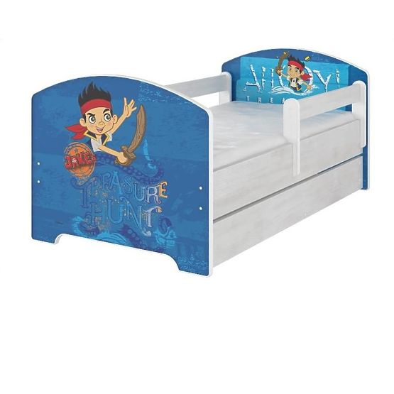 Bela otroška postelja z varnostno ograjo z motivom Disneyjeve pravljice Jakec in pirati iz dežele Nije. Postelji sta priloženi dve varnostni ograji in posteljno dno iz masivnega borovega lesa.