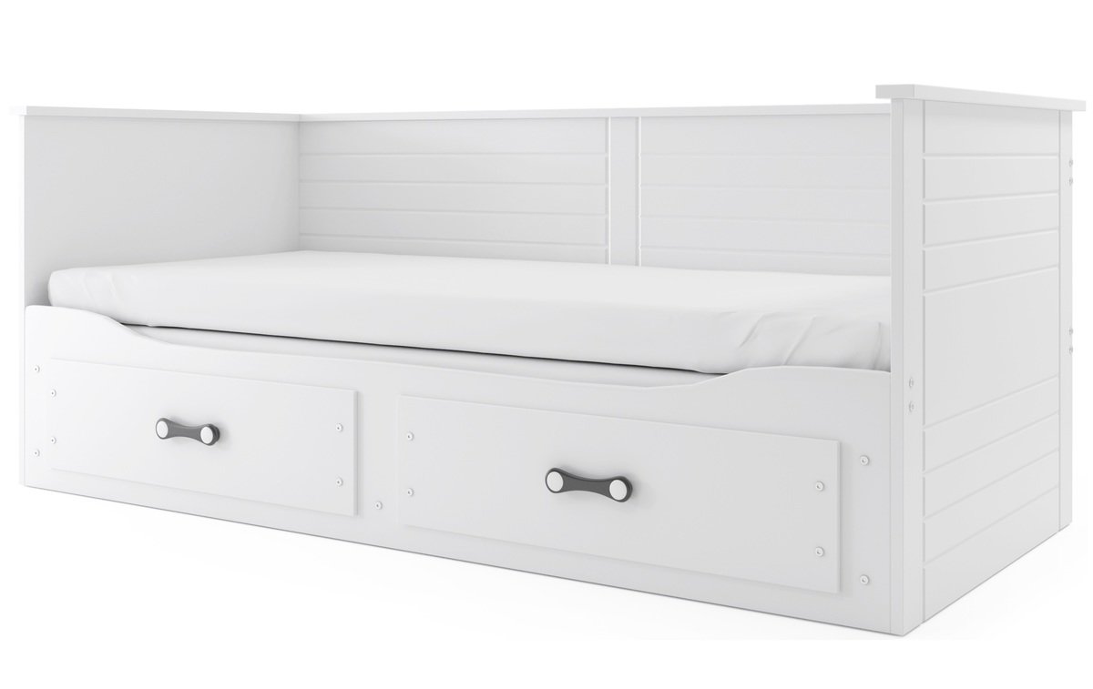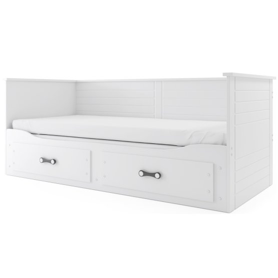 Bela zložljiva postelja HERMES z dvignjeno zadnjo ploščo je idealna izbira za otroško sobo za 2 otroka. Zahvaljujoč velikosti vzmetnice 200x80 cm, dobite posteljo, ki je primerna za otroke do odraslosti. Mogoče vam bo všeč tudi vam.