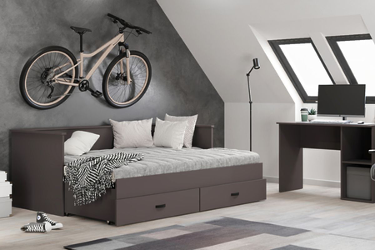 Model HELIOS je rešitev, ustvarjena z mislijo na funkcionalnost in estetiko. Ko je postelja zložena, služi kot udobna kavč, kar prihrani prostor in ustvari prijeten prostor čez dan. Dva prostorna predala na krogličnih vodilih omogočata shranjevanje posteljnine, oblačil ali drugih drobnarij, kar pomaga ohranjati red v sobi. Konstrukcija iz odporne pohištvene plošče debeline 18 mm in okvir iz brezovih letvic zagotavljata stabilnost, trajnost in udobje uporabe. Ta različica omogoča izbiro vzmetnic glede na lastne preference, tako da lahko vsak prilagodi posteljo svojim individualnim potrebam.
