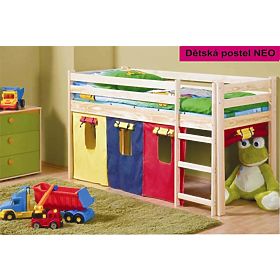 Dětská postel z masivu NEO je vyvýšená postel v provedení borovice. Dřevo je elegantní, lakované a splňuje předpoklady bezpečného používání u dětí.
