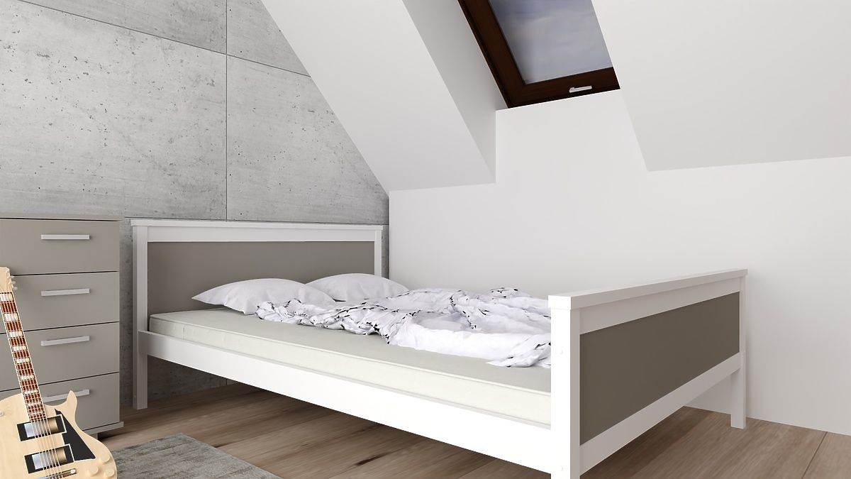 Enojna postelja kraljevskih dimenzij - tako lahko imenujemo leseno posteljo Ikar z dimenzijami 200 x 120 cm. Postelja v sivo-belih tonih je moderna, lepa, funkcionalna in primerna za vse vrste notranjih prostorov.
