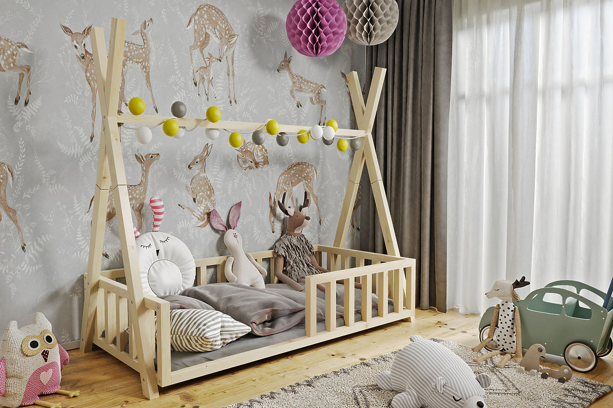 Čudovita otroška postelja Tipi v naravni barvi se odlično prilega v vsako otroško sobo. Ustvarja vtis majhnega skrivališča ali šotora, kar spodbuja otroke k igram na pustolovce, Indijance in popotnike. Nizka postelja z ograjo jim nudi varno in udobno okolje ne samo za igro, ampak predvsem za počitek in nočni spanec. Brezčasen dizajn in uporaba kakovostnega borovega lesa delujeta v otroški sobi estetsko prijetno in ustvarjata harmoničen prostor za naravni razvoj otrok.