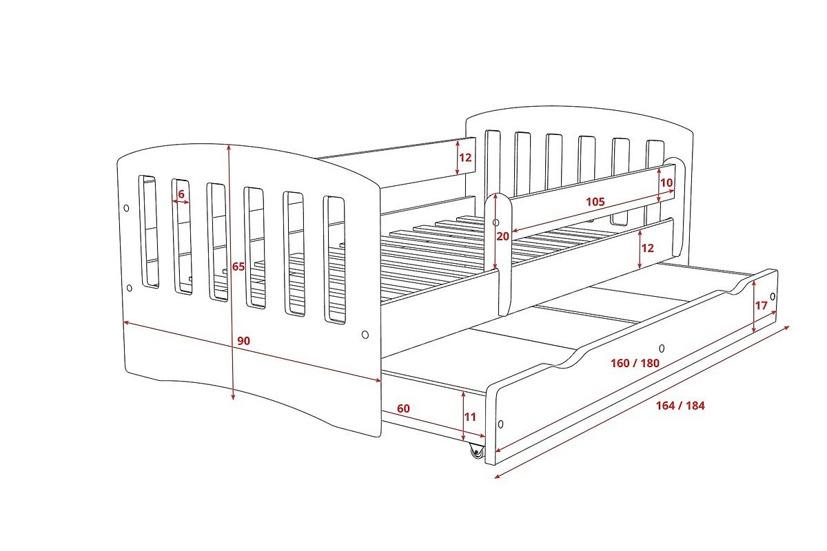 Délka zábrany (105 cm) je pro všechny velikosti postelí stejná.