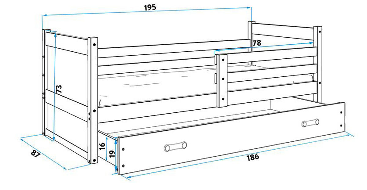 Jednoduchá bílá postel Rocky do dětského pokoje se šuplíkem a bezpečnostní zábranou. Vlastnosti:- zábrana je univerzální, při montáži si určíte, na kterou .. več