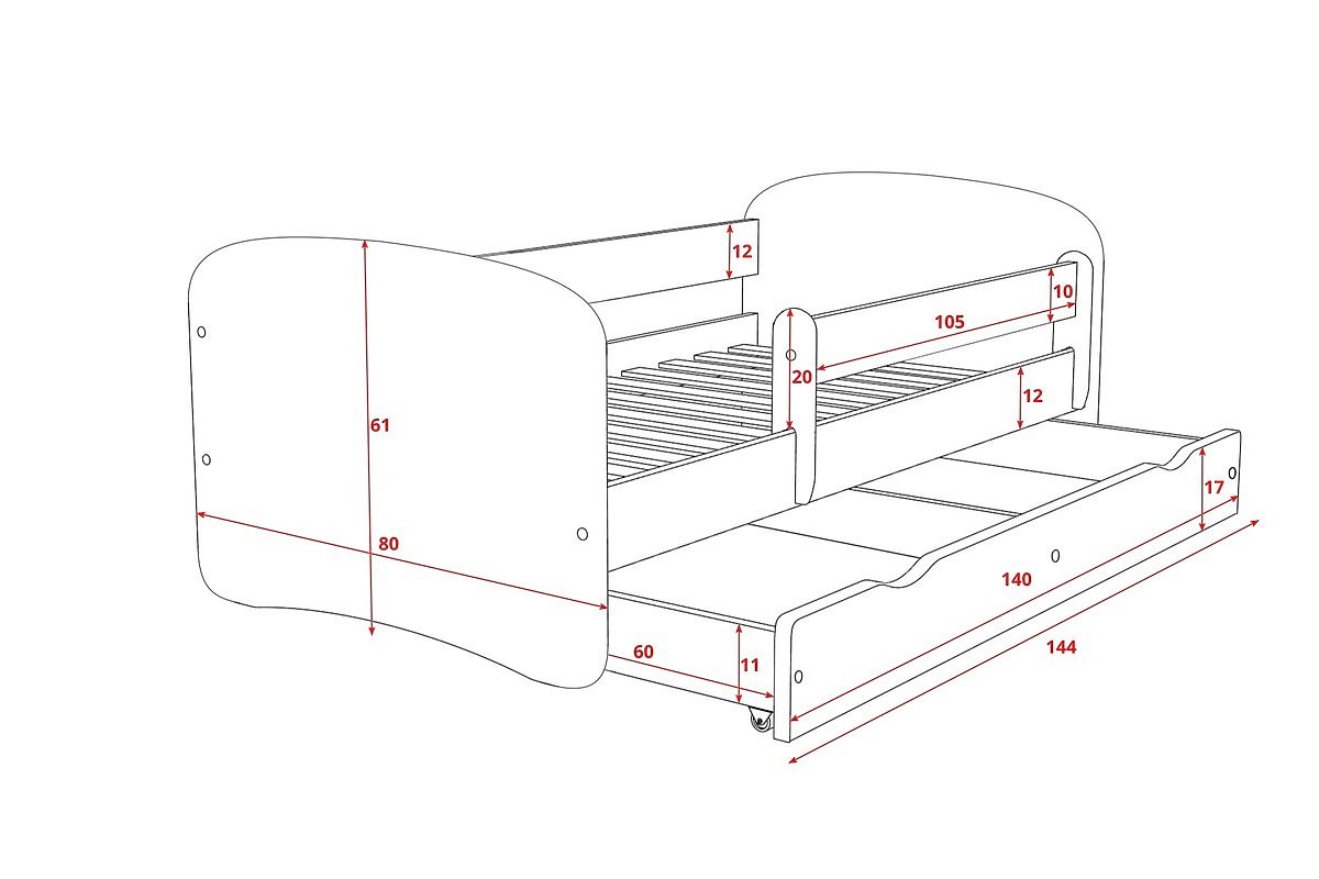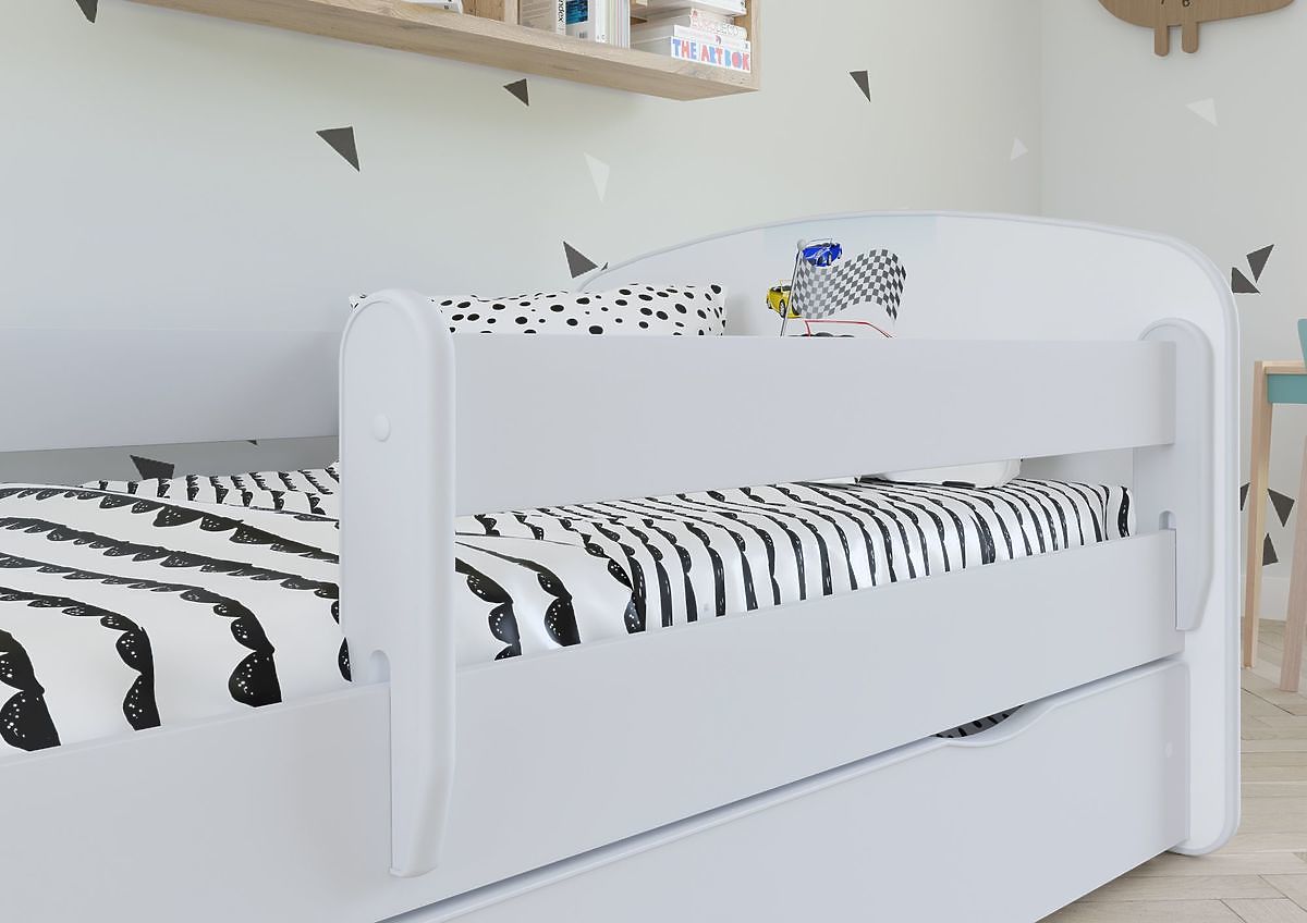 Dětská postel nabízí maximální bezpečí díky zaobleným hranám, o které se děti neporaní. Před nepříjemným pádem z postele dítě ochrání ochrání snímatelná zábrana o délce 100 cm.