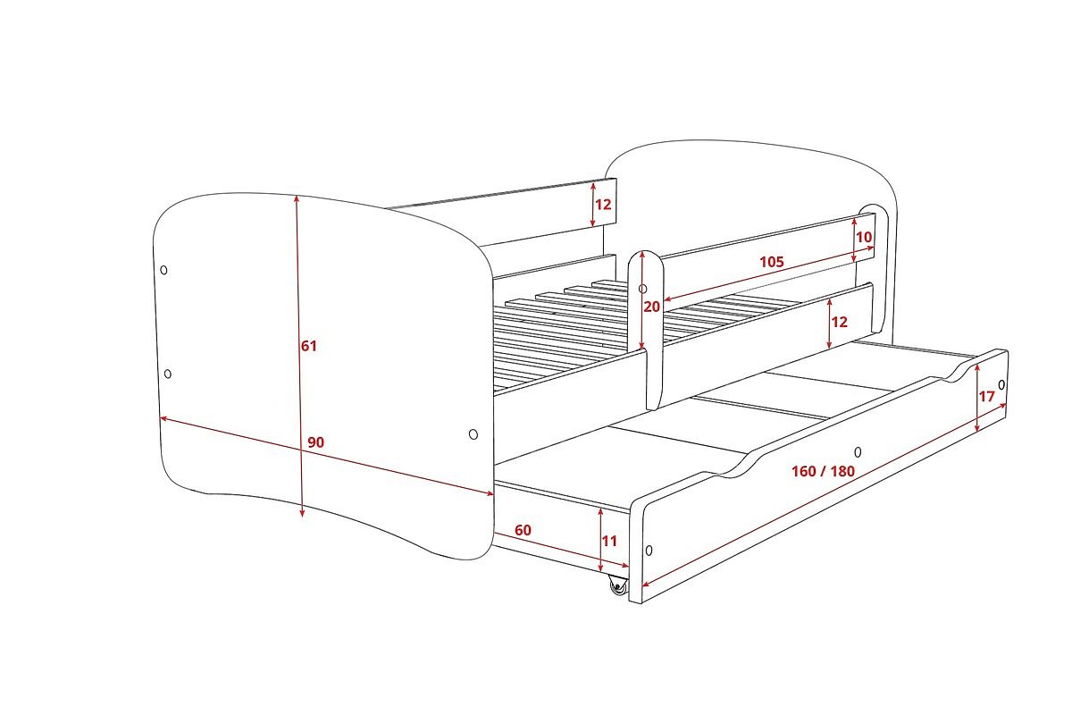 - Dětská postel včetně zábrany je vyrobena z vysoce kvalitní laminované nábytkové desky o tloušťce 18 mm.