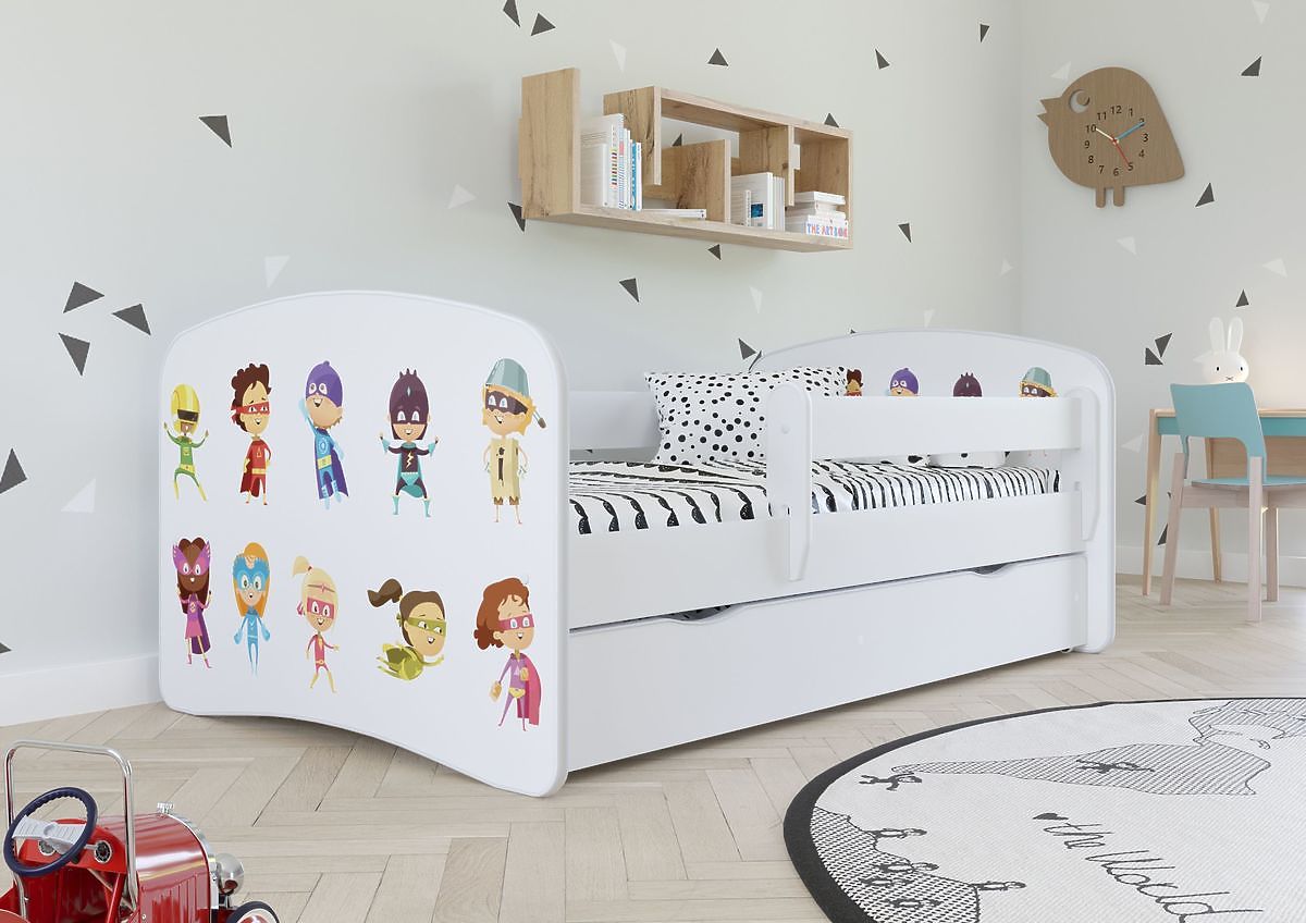 Dětská postel s obrázkem deseti malých superhrdinů na bílém pozadí. Každý hrdina má originální superoblek. Je jen na dětské fantazii, jakou superschopnost každému z nich vymyslí. Postel je vhodná do dětského pokoje pro kluky i holky.