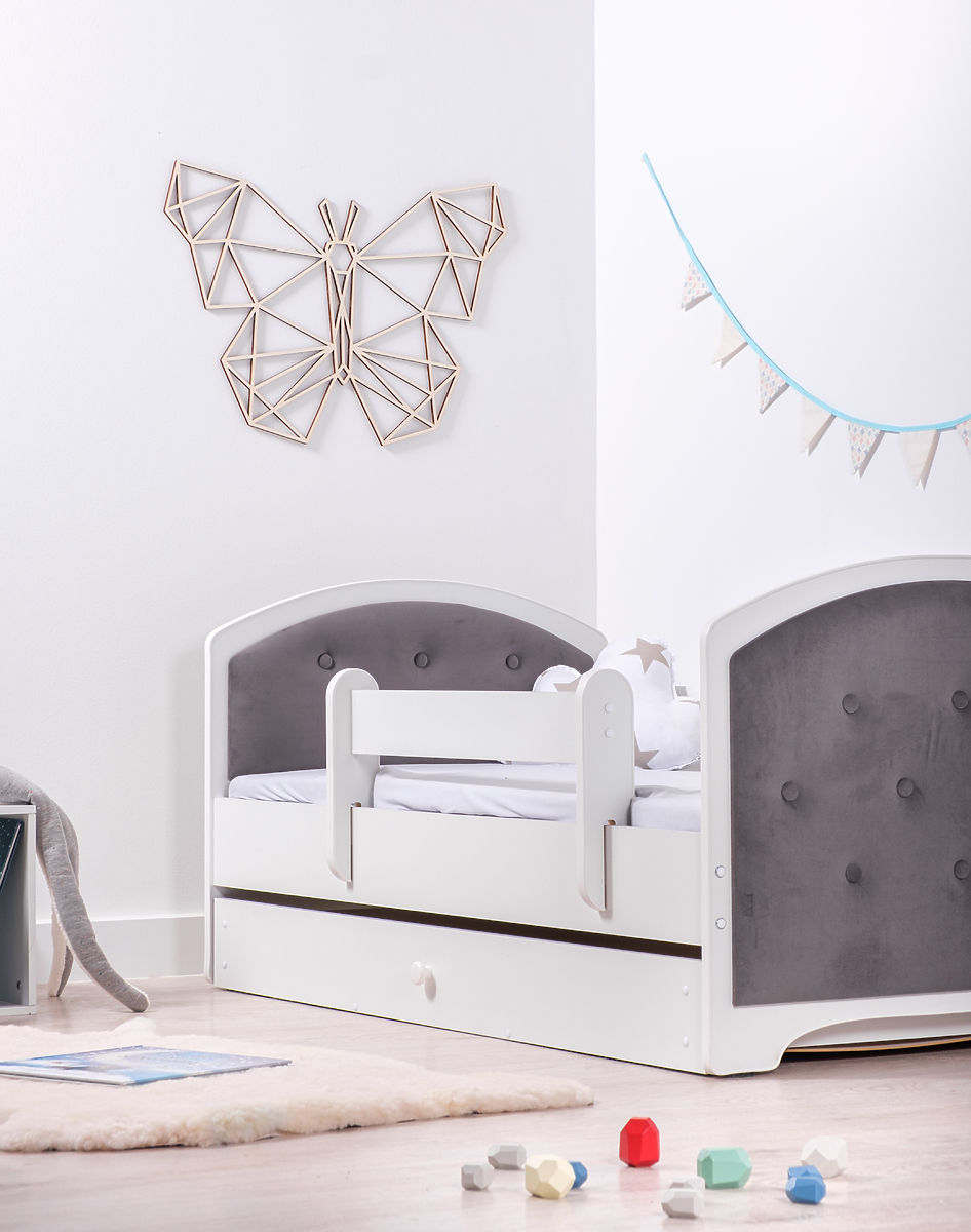 Oblazinjena otroška postelja z varnostnimi ograjami in shranjevalnim prostorom. .. več