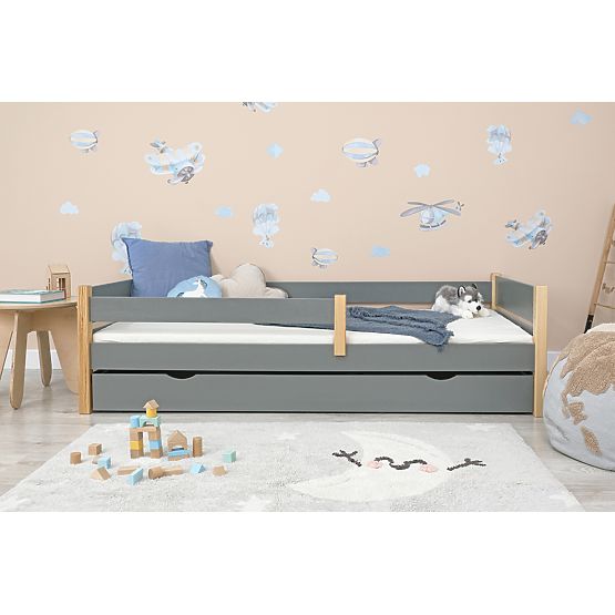 Slogovna otroška postelja z ograjo v elegantni kombinaciji sive in naravne barve se odlično prilega vsakemu otroškemu sobi. Postelja ponuja varno in udobno okolje za igro, dnevni počitek in nočni spanec. Zaradi varnostne ograje nudi otroku zaščito pred padcem. Sodobna zasnova in kakovostna izdelava postelje ustvarjata prijeten in estetsko privlačen videz v sobi.
