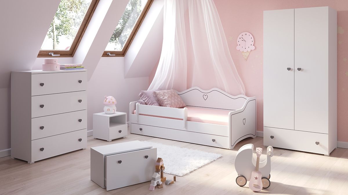 Funkcionalnost modela EMMA poudarja vrsta praktičnih rešitev, ki olajšajo vsakdanje življenje. Postelja je opremljena s prostornim predalom na kolescih, ki je idealen za shranjevanje posteljnine, igrač, iger ali drugih predmetov, kar pomaga ohranjati red v otroški sobi. Dodatna prednost je premična zaščitna ograja, ki jo je mogoče namestiti na katero koli stran postelje, kar povečuje njeno univerzalnost in varnost. Konstrukcija postelje prenese obremenitev do 110 kg, zato lahko služi več let. Uporaba vzmetnih letvic v sistemu FLEX zagotavlja optimalno podporo telesu, kar vpliva na kakovost spanja. Poleg tega visoko vzglavje omogoča, da postelja čez dan služi kot udoben kavč – idealno za branje, igranje ali počitek. Ta večfunkcionalna rešitev je primerna tako za manjše kot večje prostore, popolnoma ustreza potrebam otrok in njihovih staršev.