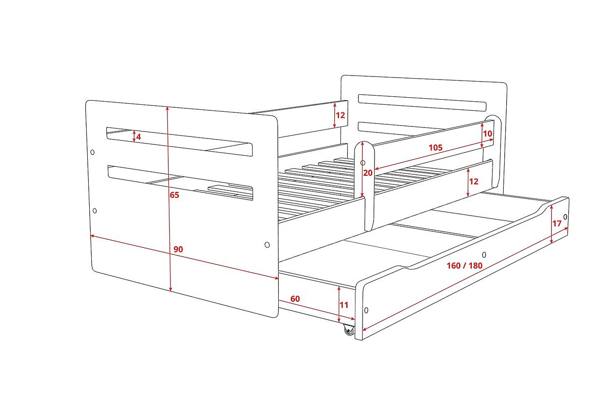 Izdelana je iz visokokakovostnega laminiranega materiala. Vzglavje je trikrat premazano z okolju prijaznimi in zdravju varnimi laki. Postelja je zelo stabilna, njena nosilnost pa je do 150 kg. Varnost zagotavljajo zaobljeni robovi. Posteljno dno je izdelano iz borovega lesa, letvice pa zagotavljajo ustrezno podporo in prezračevanje vzmetnice. V ceno so vključeni postelja, posteljno dno in ograja. Vzmetnica ni vključena, zato jo je treba naročiti v želeni velikosti v razdelku Vzmetnice.