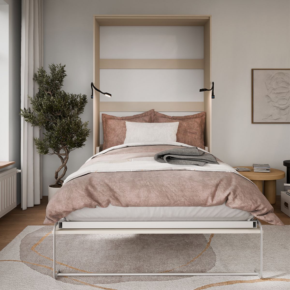 Zložljiva postelja VERTO 140x200 je elegantna, vertikalna postelja, skrita v omari, ki omogoča, da v nekaj trenutkih ustvarite prijeten spalni prostor tudi v majhnem prostoru. Idealna za tiste, ki želijo združiti udobje z maksimalno izrabo prostora.