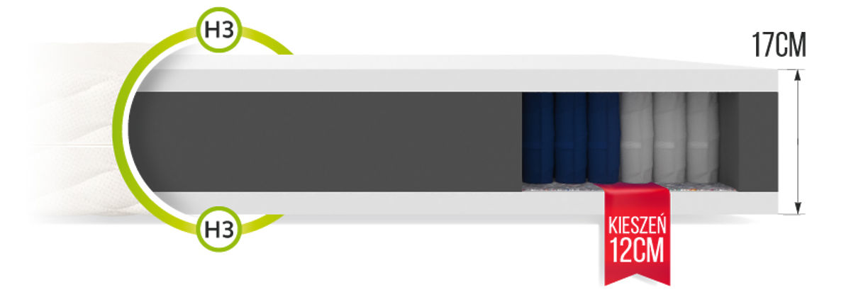 Dvostranska vzmetnica TREVISO višine 17 cm je klasičen model žepkaste vzmetnice . Njegova osnova je oblika žepa. Žepkaste vzmeti so izdelane s tehnologijo NanoHARD in zahvaljujoč dvojno kaljeni žici je njihova življenjska doba znatno podaljšana. Vzmetnico odlikuje 7 con z različno trdoto, kar zagotavlja ergonomski položaj telesa med počitkom. Vzmeti delujejo neodvisno druga od druge, kar odpravlja učinek upogibanja velike površine vzmetnice, ko se pritisk izvaja na njen majhen del. Zahvaljujoč temu ne boste čutili vrtenja ali gibanja druge osebe, kar bo zagotovilo globok in nemoten spanec. Žepni vložek je obdan s T25 pur peno , ki ima visoko odpornost proti deformacijam, je prožna, dobro zračna in stabilizira telo med počitkom. Med vzmeti in peno je bil vstavljen ločevalni material . To je naravni filc, ki lahko bistveno podaljša življenjsko dobo vzmetnice in okrepi njeno konstrukcijo.
