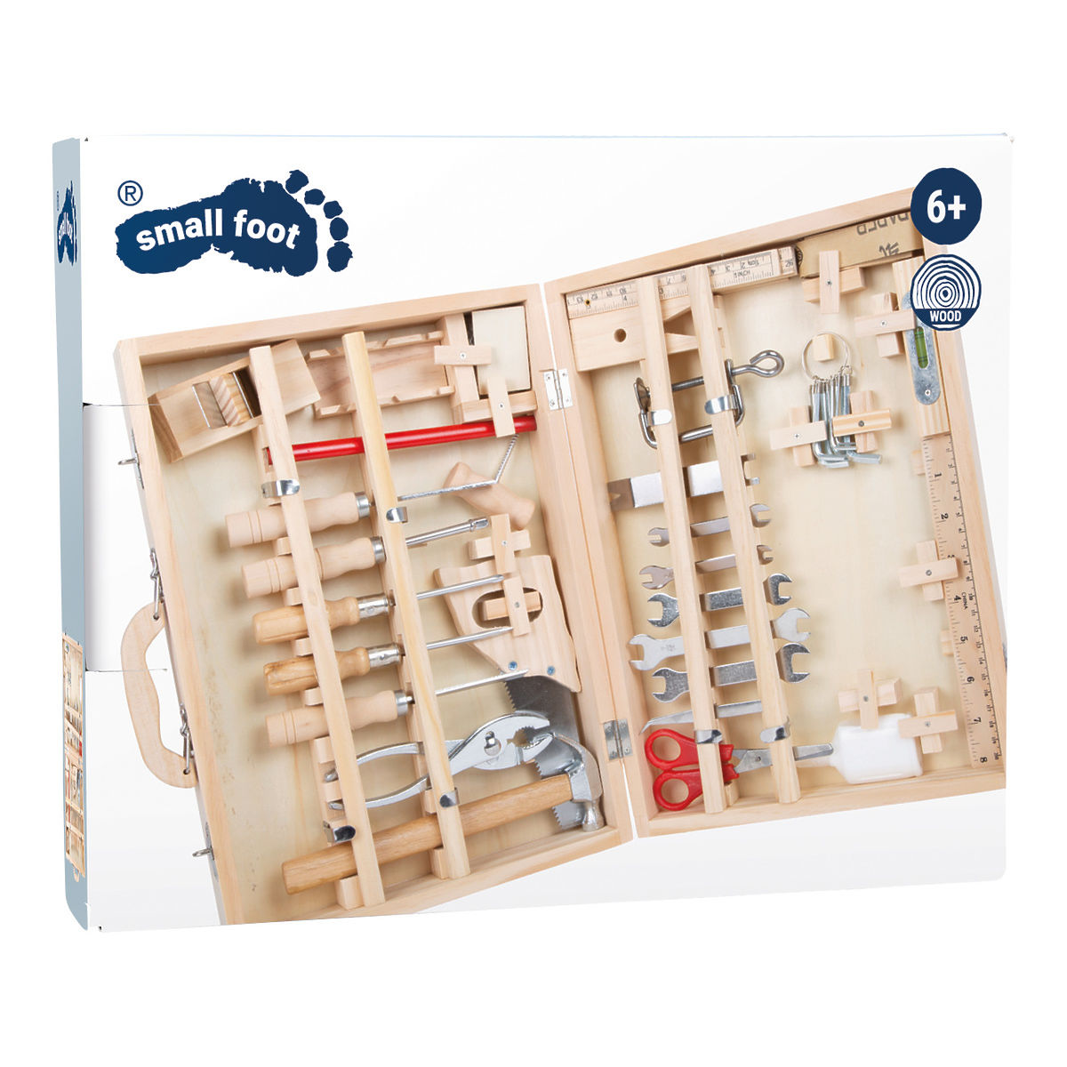 Deluxe Case je obsežen komplet orodij: viseča lesena škatla z 48 deli za male domače mojstre! V kovčku Deluxe boste našli vse potrebno leseno in kovinsko orodje za vse vrste del in popravil. Našli boste ključe, izvijače, žago, škarje, dleto, mizarski svinčnik, imbus ključ, kladivo in še več! Vsak element ima svoje mesto v ohišju, vsi deli so opremljeni z varovalkami, ki jih držijo na mestu. Glavne značilnosti: Obsežen komplet vsebuje 48 delov Praktična lesena škatla za shranjevanje