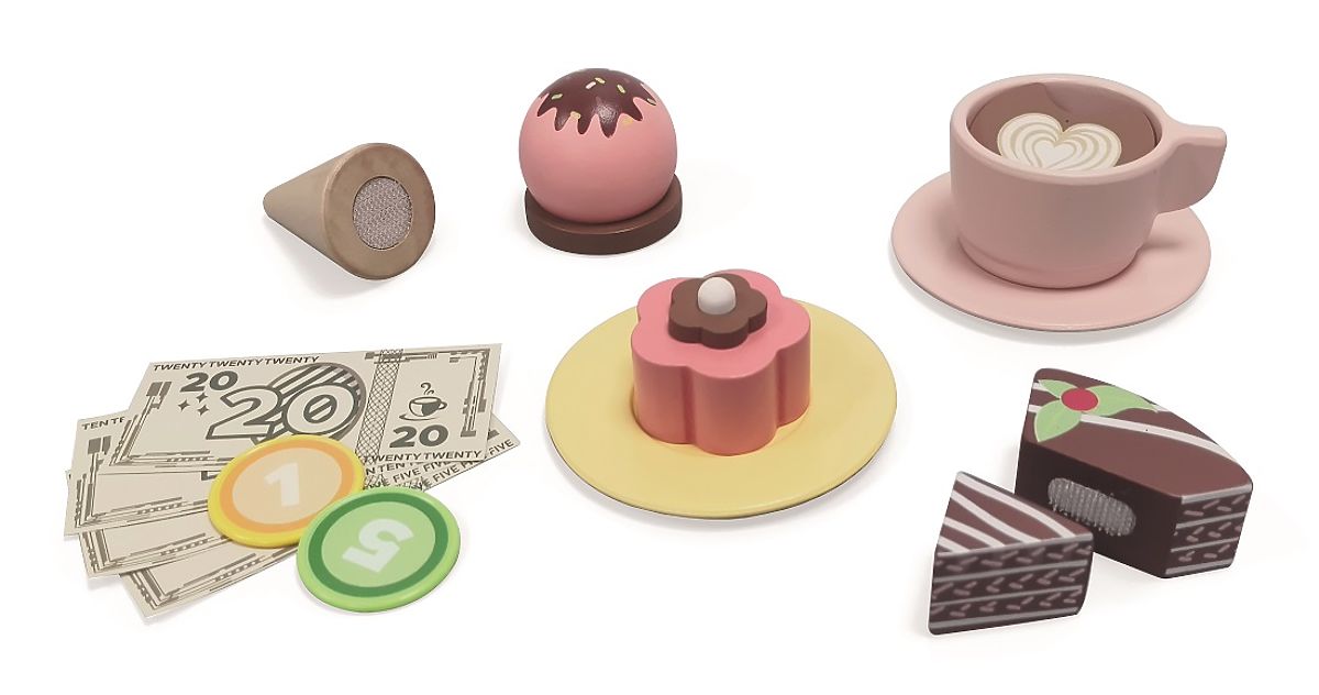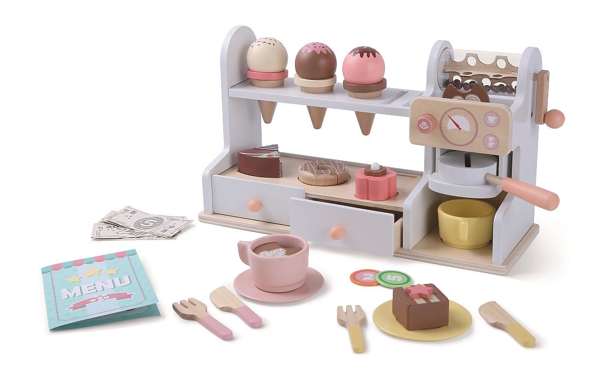 Postani pravi barista ali trgovec! Bi želeli sladoled, tortico ali samo okusno kavo? S tem kompletom s 46 deli boste uživali ure zabave. Komplet ponuja skodelice s krožniki, pribor in žlice, pult s kavnim aparatom, vitrino s torticami in polico z luknjami za sladolede. Ne manjkajo niti predali s prostorom za shranjevanje denarja, ki je prav tako del tega kompleta. Igrače za igranje vlog spodbujajo otroško domišljijo in navdihujejo k ustvarjalni igri, kar pozitivno vpliva tudi na njihov besedni zaklad in razvoj jezika. Glavne lastnosti: vsebuje 46 delov, podpira razvoj jezika in besednega zaklada