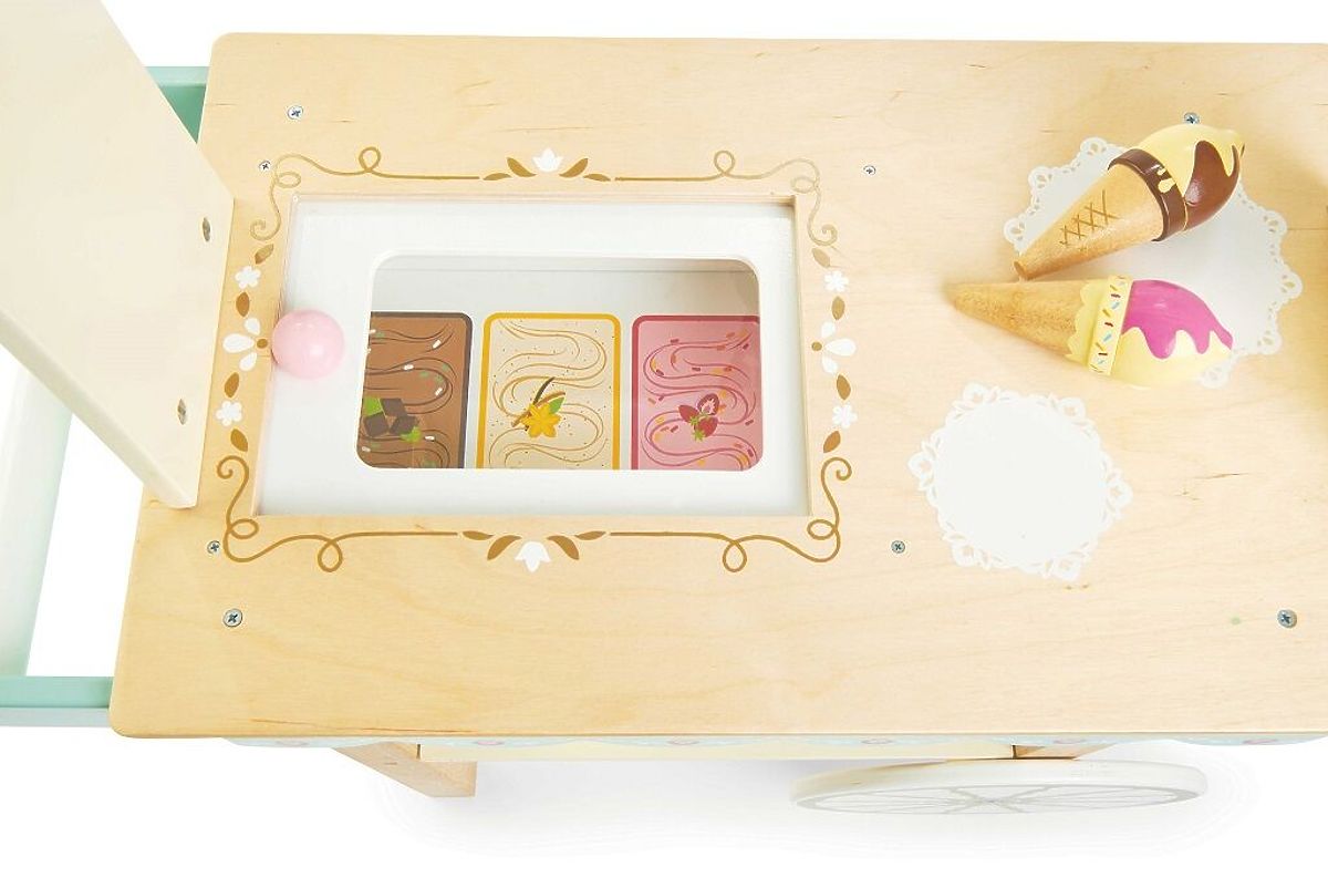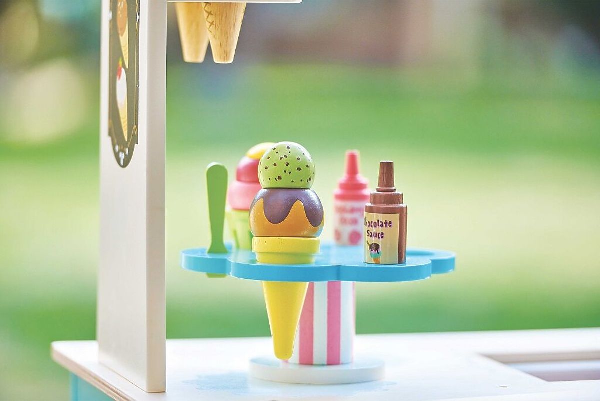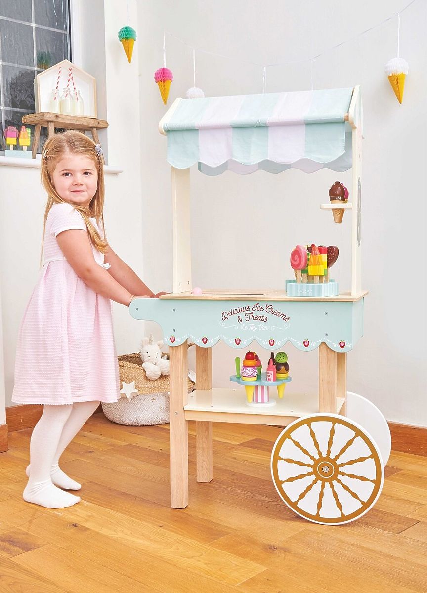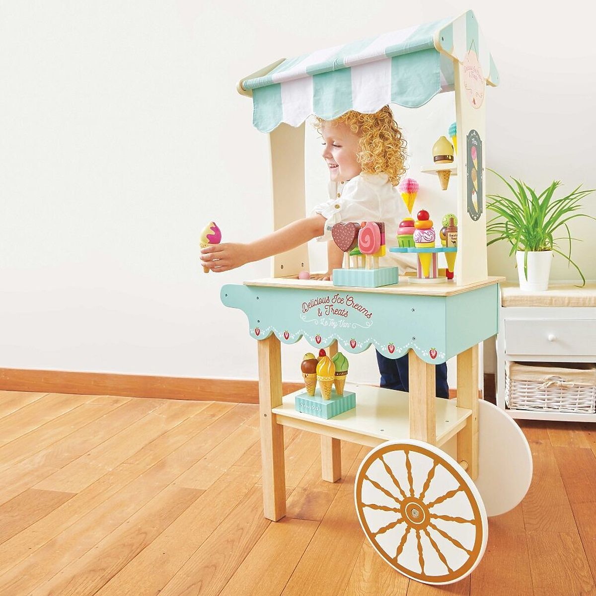 Poletna osvežitev! S stilskim vozičkom za sladoled, ki ga danes res redko vidimo, se lahko otroci igrajo sladoledarja in sladoledarko. Retro voziček za sladoled je popoln za domišljijsko igro v otroški sobi ali na vrtu. Klasičen črtast tkan baldahin, pastelne barve in zlate podrobnosti, ta resnično edinstvena igrača je izdelana iz trajnostnega lesa in oblikovana tako, da bo zdržala mnogo let domišljijske igre. Ima veliko realističnih funkcij, ki jih otroci lahko odkrivajo med igro. Predal za led z drsnimi vrati, ki razkrijejo ilustracije klasičnih okusov sladoleda, dva magnetna sladoledna korneta, premična kolesa, ki omogočajo serviranje sladoleda kjerkoli. Igrače z namenomVse igrače podjetja Le Toy Van so narejene z namenom - da dolgo trajajo. Oblikovane z ljubeznijo izkušenih obrtnikov z uporabo etičnih praks in trajnostnih materialov, ki so prijaznejši do našega planeta. Glavne značilnosti: etično izdelano iz trajnostnega lesapreverjeno po najstrožjih standardihpobarvano z netoksičnimi barvami na vodni osnovispodbuja domišljijsko igroprimerno za igro vlogigrača je prejela nagrade Nagrade za igrače:Right Start Top Investment Award 2019Right Start Winner 2019Good Toy Guide Recommended Honeybake kolekcija: Igrače v tej kolekciji so primerne za raziskovanje, pomagajo otrokom pri razvoju domišljije, socialnih in verbalnih veščin ter kognitivnih funkcij. Tradicionalna zasnova z modernimi podrobnostmi bo zagotovo zabavala otroke. Honeybake je kolekcija Le Toy Van, ki je prejela največ nagrad, in sicer za oblikovanje, kakovost, varnost ter tudi za izobraževalno in igralno vrednost.