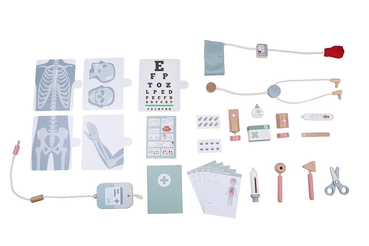 Igra s tem kompletom ni le odlična zabava, temveč tudi učenje. Otroci se učijo empatije, premagovanja strahu, odgovornosti in skrbi za druge. Ta igrača spodbuja domišljijo, omogoča odkrivanje skrivnosti poklica zdravnika in uči prepoznavanja orodij, potrebnih za to delo. Igra poleg tega oblikuje ročne spretnosti. Poznate višino svojega pacienta? Ne? Potem ga izmerite! Izmerite mu tudi tlak ali temperaturo, ga poslušajte in vse skrbno zapišite v kartoteko pacienta. Lahko preverite tudi vid ali sluh in ne pozabite pogledati rentgenskih slik na funkcionalni osvetljeni plošči! Komplet vsebuje mizo za preglede in posege s prostorom za shranjevanje ter orodja, potrebna za delo zdravnika. Stetoskop, merilnik krvnega tlaka, termometer, pinceto, škatlice za zdravila in kreme, škarje, infuzijo, 4 rentgenske slike, otoskop, injekcijsko brizgo, kladivce, kartoteke pacientov, kartice z zdravili, tabelo za pregled vida in informativne letake. Glavne lastnosti: vsebuje 30 kosov lesene bolnišnice s pripomočki, pomaga pri razvoju domišljije, govora in socialnih veščin, izboljšuje komunikacijske in motorične spretnosti, razvija domišljijo in ustvarjalnost, funkcionalna plošča za osvetlitev rentgenskih slik - 2xAAA baterije niso priložene