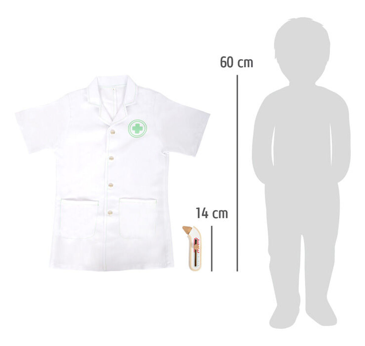 Popoln igralni komplet z zdravniškim plaščem in medicinsko opremo. Vsebuje injekcijsko brizgo, stetoskop in termometer iz robustnega lesa. Bat brizge se ob pritisku potegne nazaj. Termometer ima nastavljiv kazalec temperature. Zdravniški plašč ima dva praktična žepa in se zapenja s pritiskači, tako da ga lahko mladi zdravniki hitro oblečejo in slečejo. Odlična igrača za igranje vlog ali kot kostum za karneval. Primerno za otroke, ki so visoki 105-110 cm (velikost 110). Odličen dodatek k zdravniški torbi in drugim podobnim izdelkom. Glavne lastnosti: zdravniški plašč in dodatki za otroke visoke 105-110 cm, odlično za igranje vlog ali karneval.